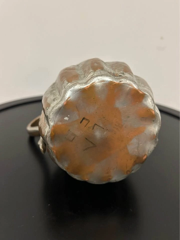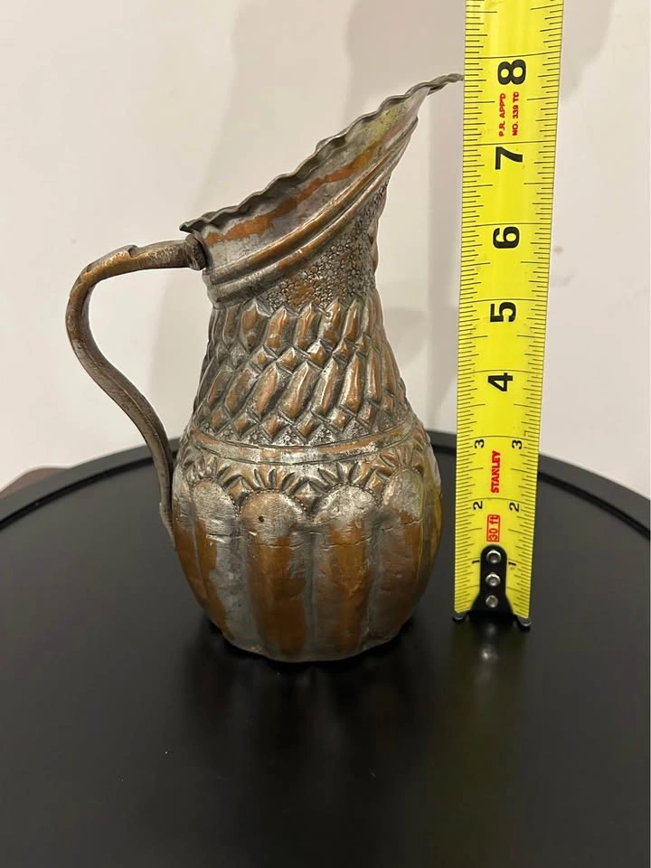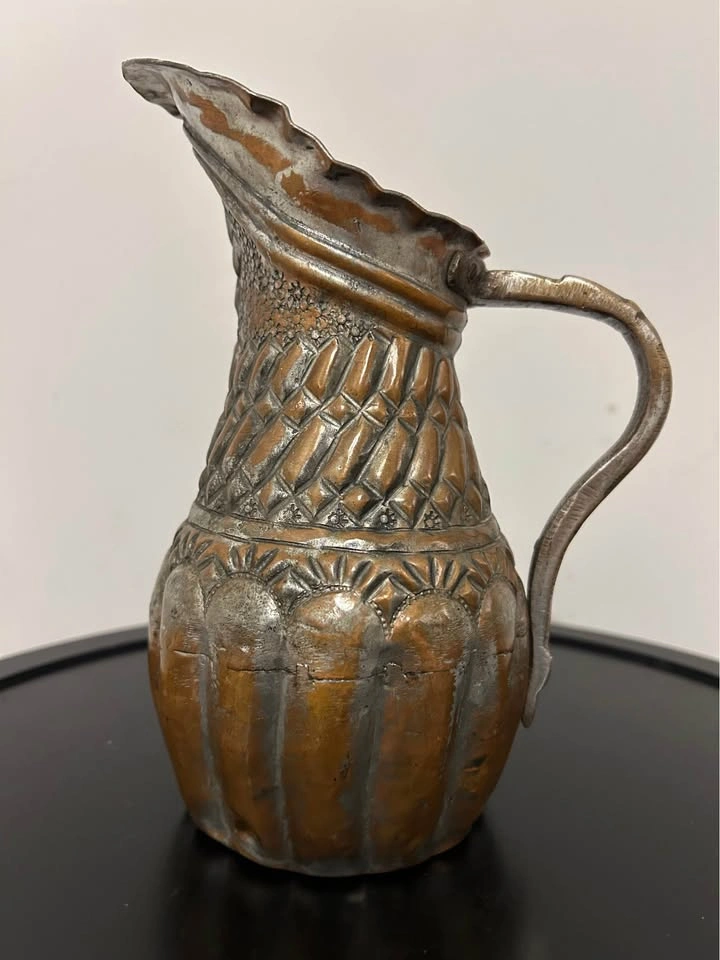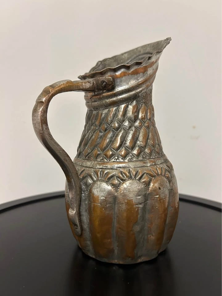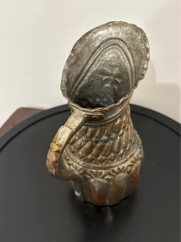The silvered tin overlay over warm copper tones gives this piece a rich, aged patina and a striking contrast. A remarkable collectible item, perfect for display, home decor, or antique collections. Measurements can be seen in the photos.