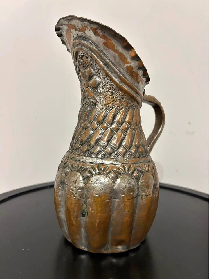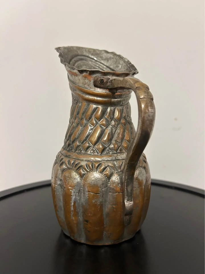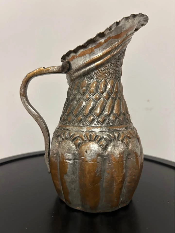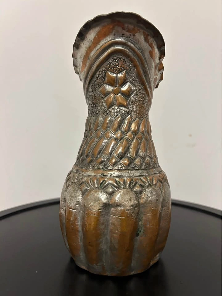 The silvered tin overlay over warm copper tones gives this piece a rich, aged patina and a striking contrast. A remarkable collectible item, perfect for display, home decor, or antique collections. Measurements can be seen in the photos.