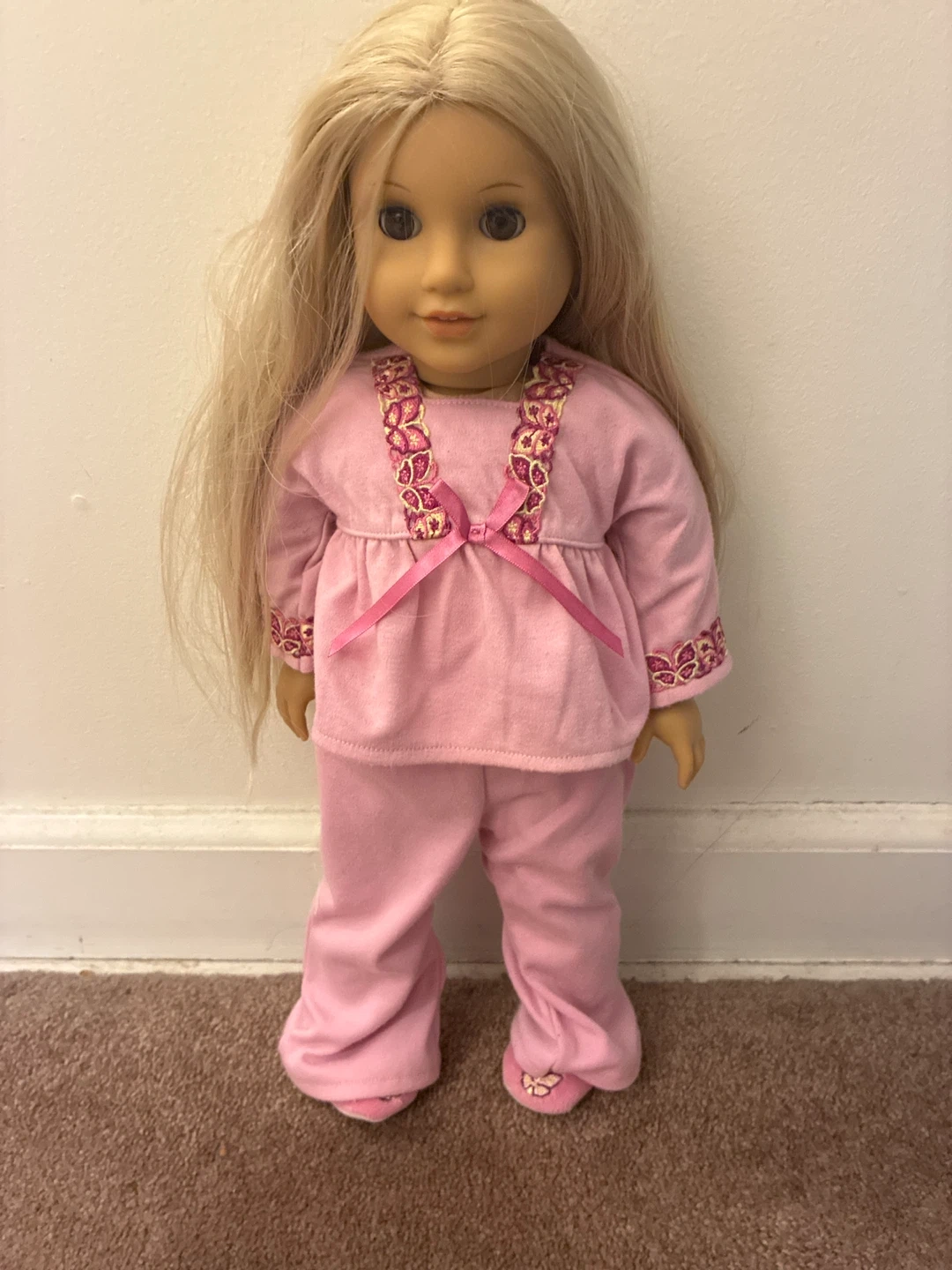 This is an American Girl doll dressed in pink pajamas. She has blonde hair and brown eyes. Great condition!