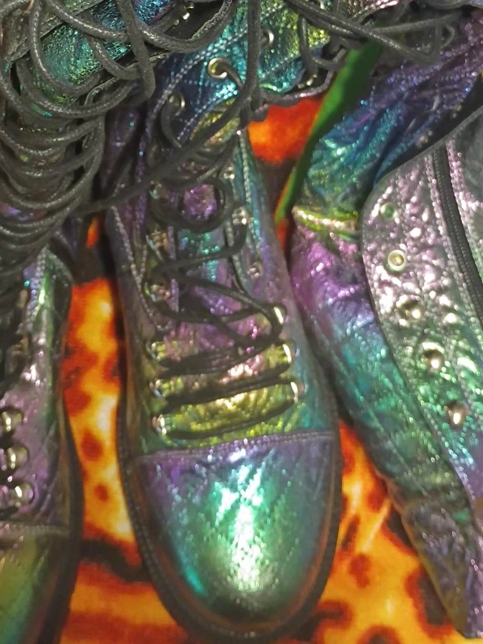 These are some really cool iridescent lace-up boots! They have a unique colour-shifting effect that catches the light beautifully. Perfect for adding a bit of sparkle to any outfit!