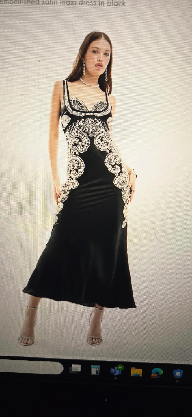 Selling a beautiful embellished satin maxi dress in black. It's a stunning piece that's perfect for a special occasion. The dress features intricate embellishments and a flattering silhouette.