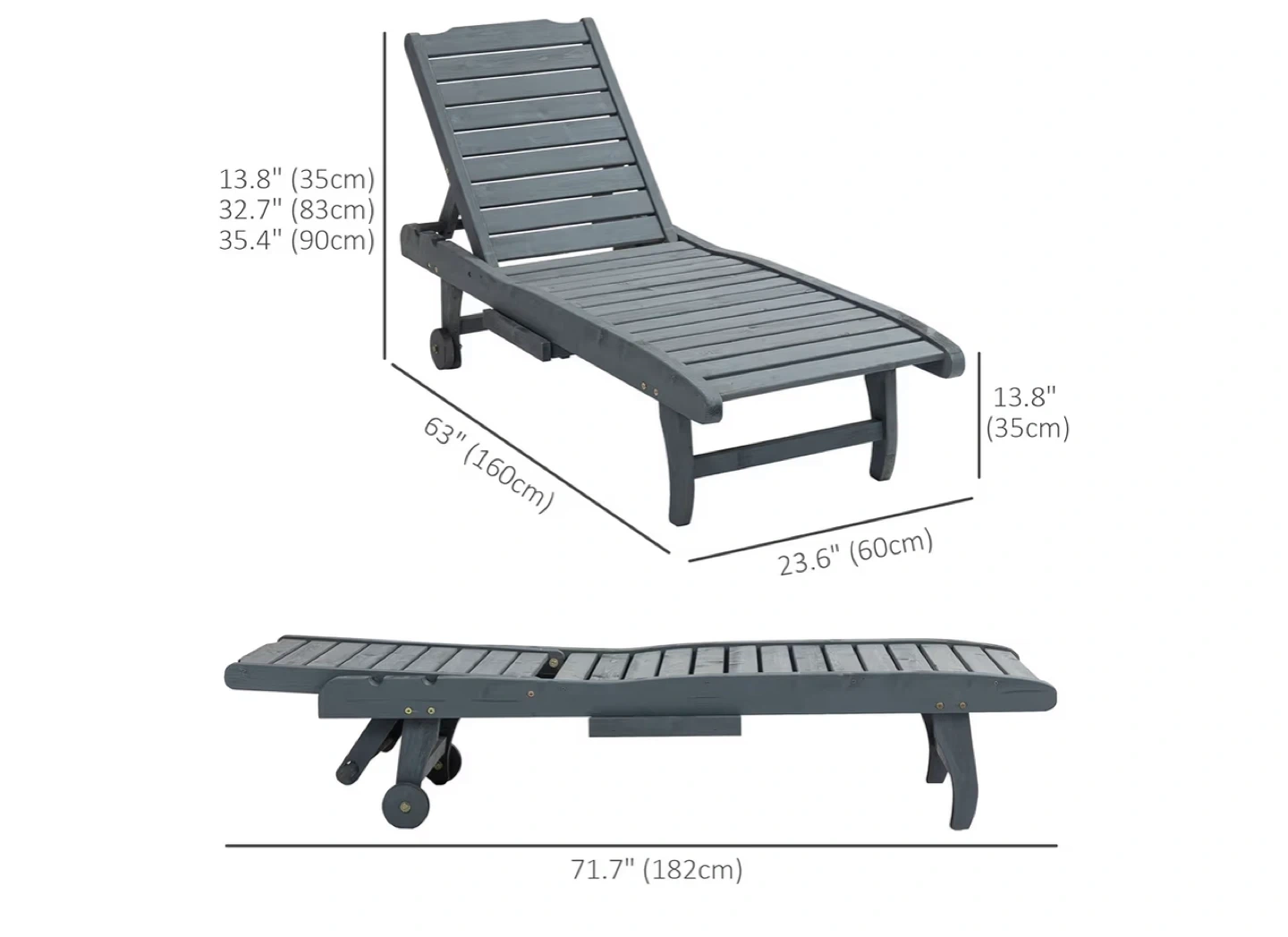 Get ready for summer with this Outsunny wooden outdoor chaise lounge chair! It features a 3-level adjustable backrest so you can lie down or recline comfortably. It's also easy to transport, equipped with 2 wheels so you can easily lift and move it from one side to the other. The dimensions are 13.8" (35cm) x 32.7" (83cm) x 35.4" (90cm). The overall length is 71.7" (182cm) and the width is 23.6" (60cm).