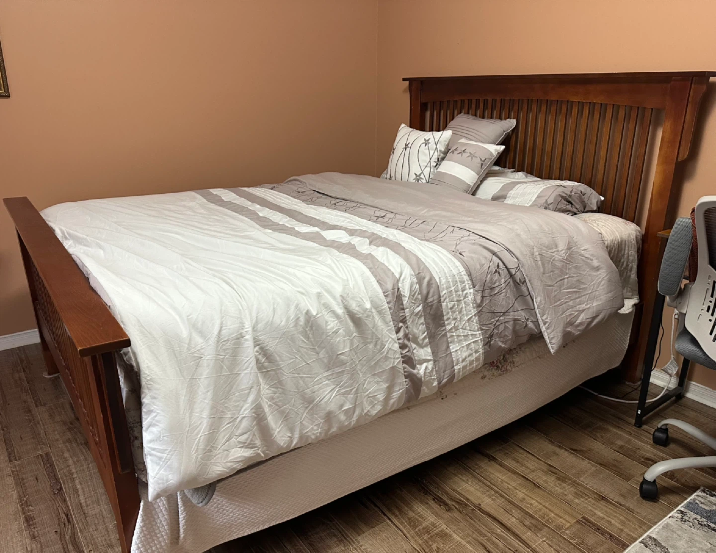 Selling a bedroom set including a bed frame and a dresser. With 2 side tables. The set is in good condition and would be a great addition to any bedroom. Mattress not included. Minor scratches.