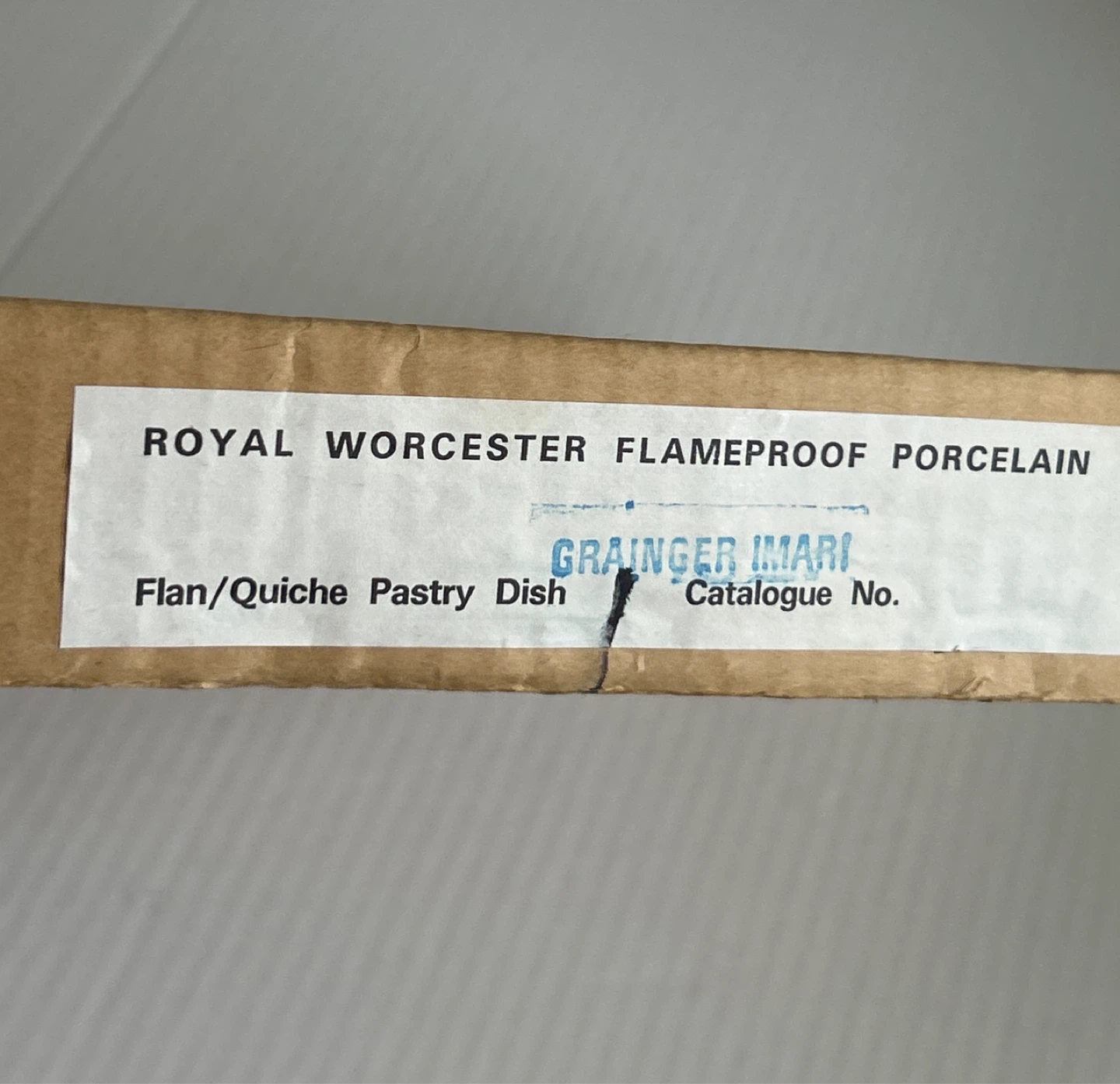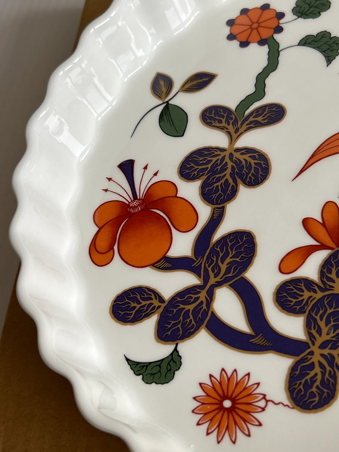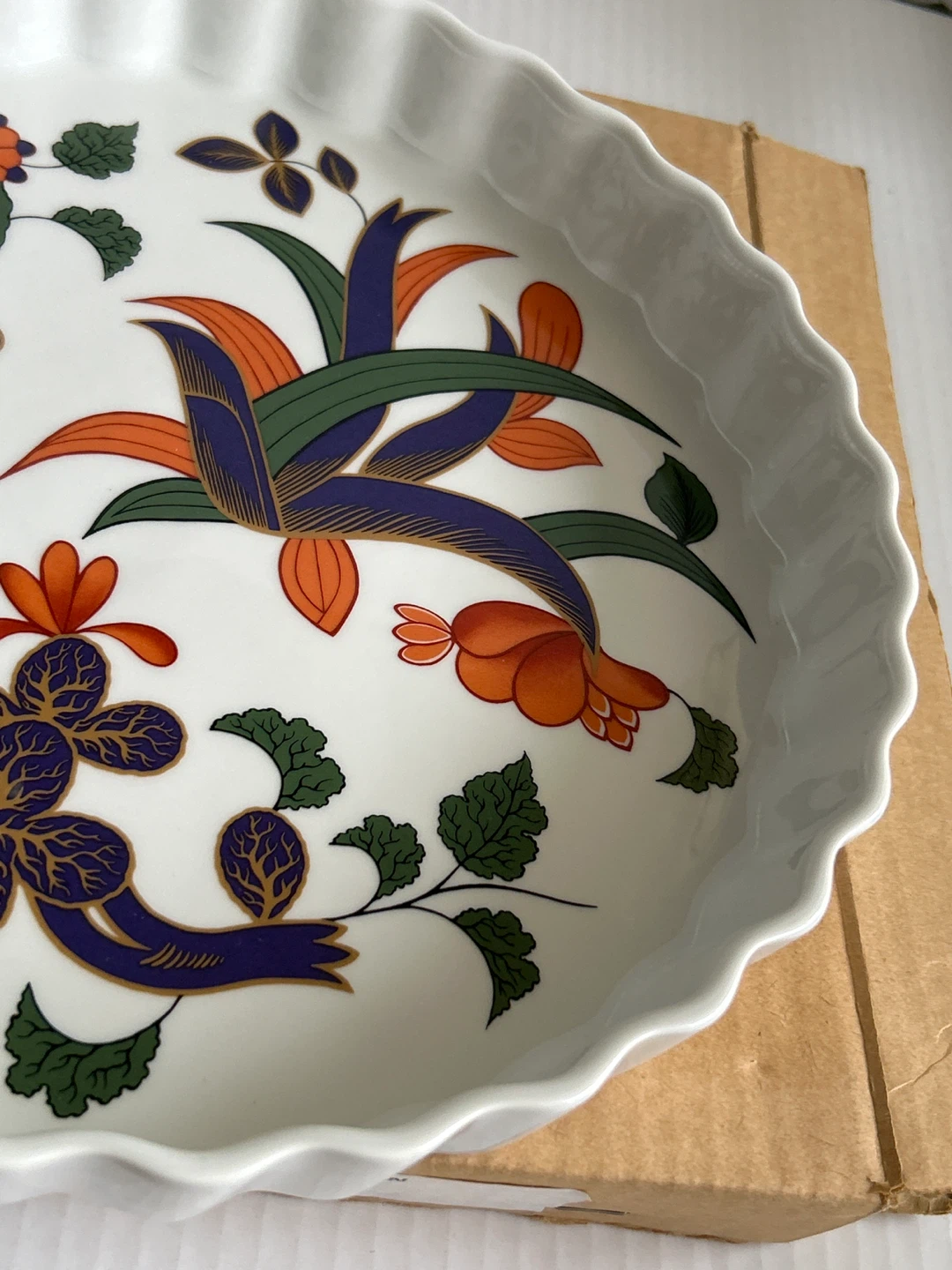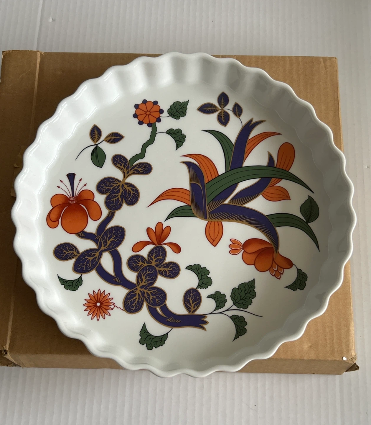 Selling a Vintage Royal Worcester Grainger Imari - pie/quiche/tart pastry dish! It's in great - like new and clean condition and comes with its original box. The dish features a beautiful floral design in orange, blue, and green on a white background. Perfect for baking your favourite recipes!