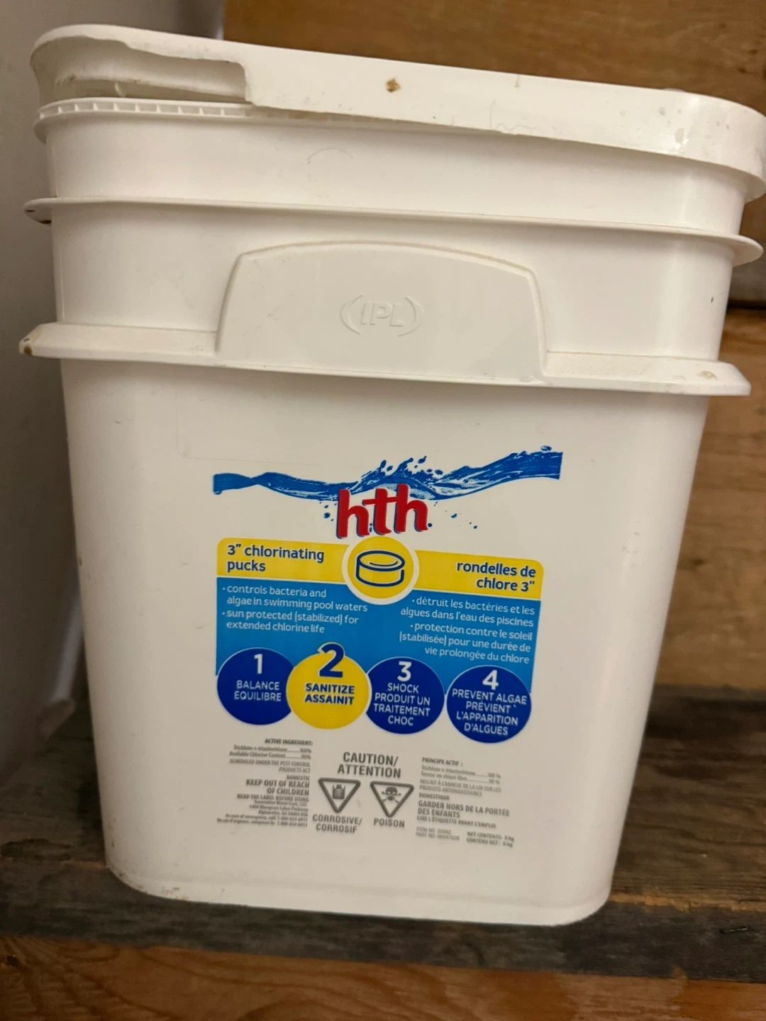 Selling a bucket of hth 3" chlorinating pucks. The package is opened as I have used a few - but the 3” is too big for my Hottub - best suited for swim spas or pools.
