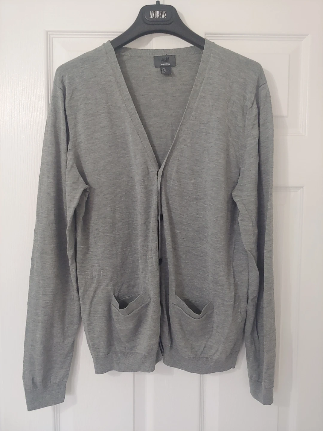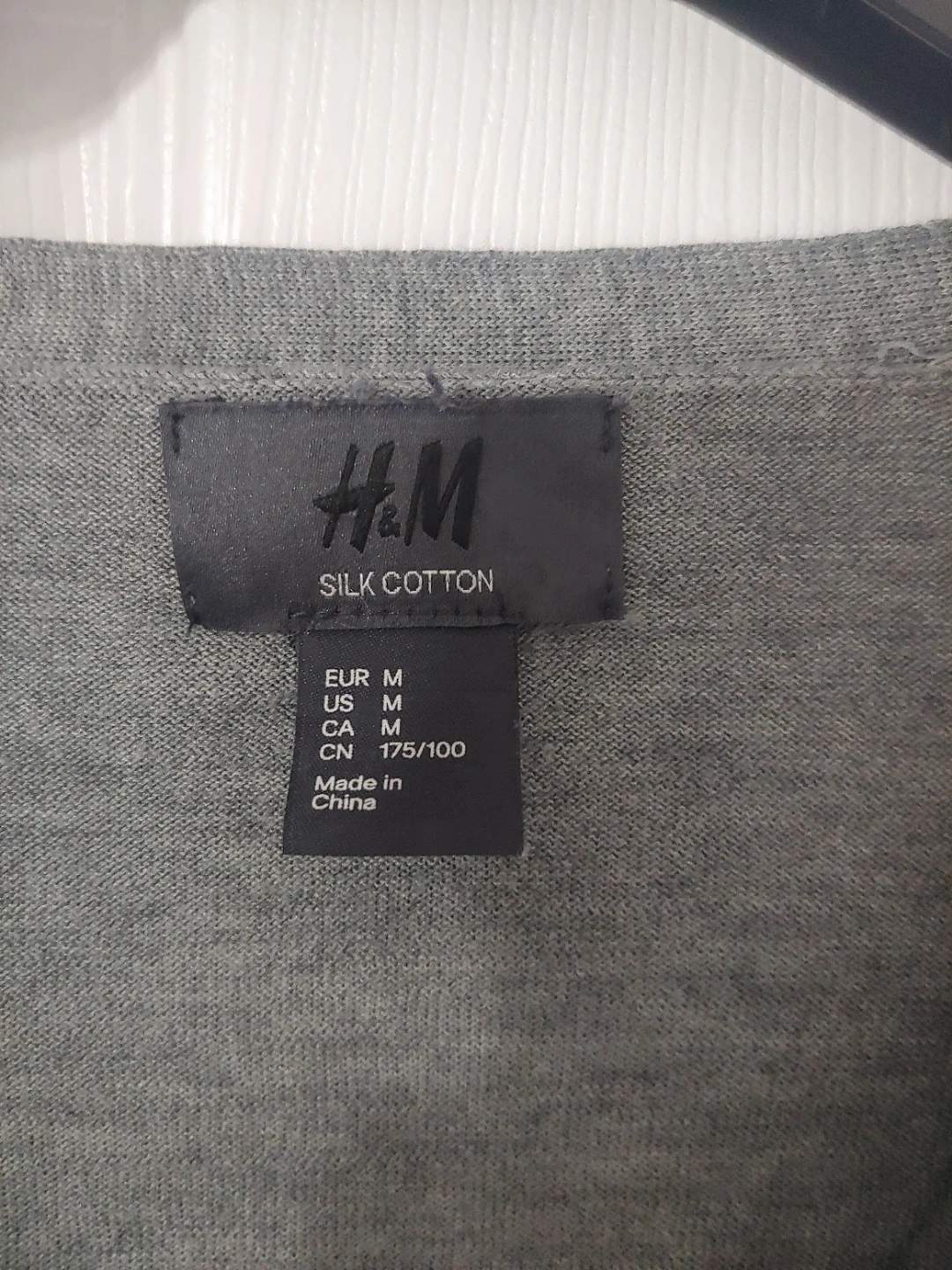 847Selling a mens H&M cardigan made from a blend of silk and cotton. It's a size M, very soft and comfortable. It was worn once and has some barely there lint on the lower back as shown. Otherwise in excellent condition.