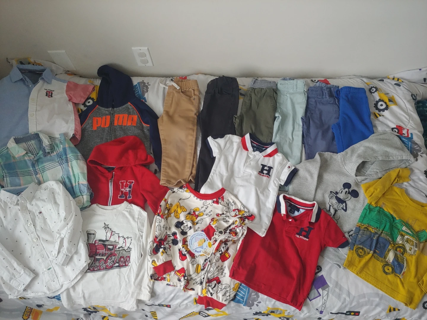 847Selling a mixed bundle of toddler boy clothing. All are 2T and 3T. All clean and in very good condition, the pyjama is brand new with tags. 18 pieces. All items from Hilfiger, Carter's, gap, h&m, joe fresh Includes: -hoodies (red one has some lint) -Long sleeve shirts -dress pants and everyday pants -brand new Mickey mouse pyjama with tags -like new long sleeve dress shirts (3) -like new tommy hilfiger golf shirts (2). Flexible Local pick up or local delivery available