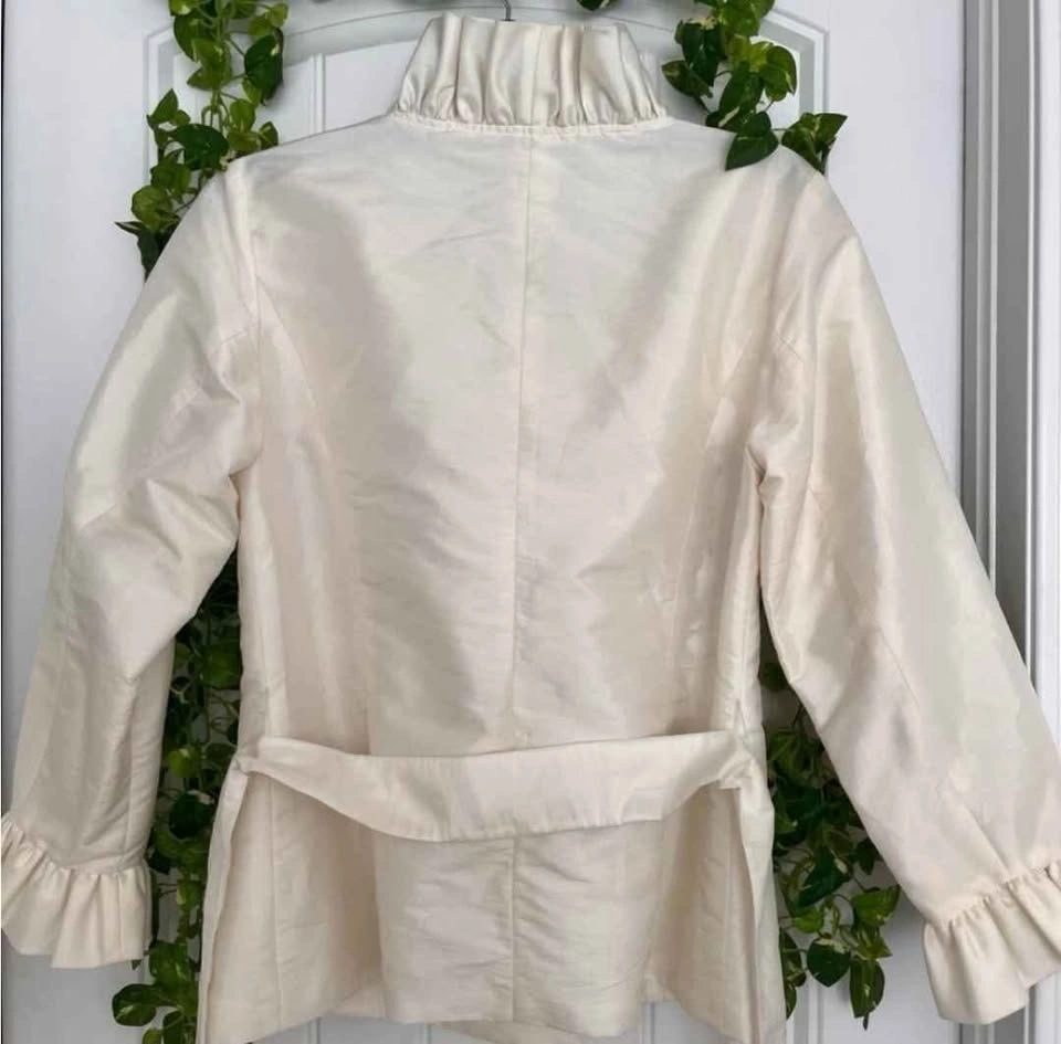 Satin ivory soft feel, has buttons and flared ruffled sleeves. Size is US Medium and has minor splatters on the inside as shown in pic but when worn does not show. Comes from smoke free, pet free home ❤️