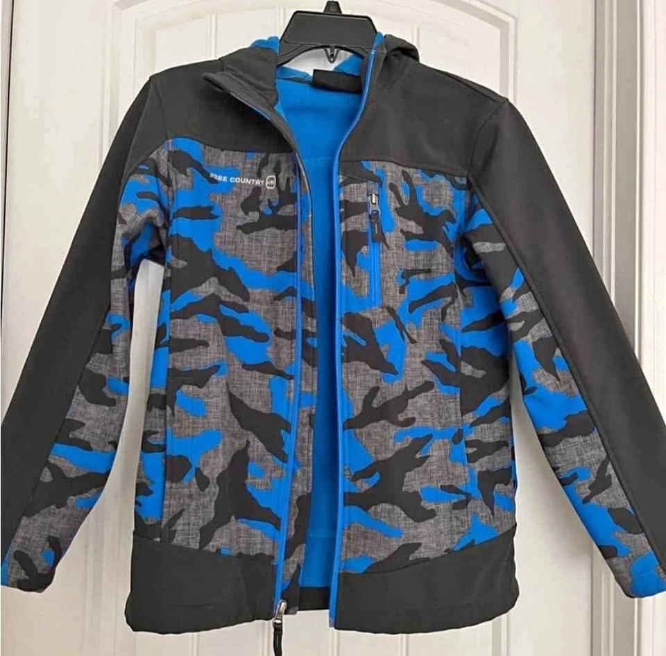 Warm light children’s jacket, perfect windbreaker and effective against the rain, has unique blue colour patterns. Size is Boys Large. Comes from smoke free pet free home ❤️
