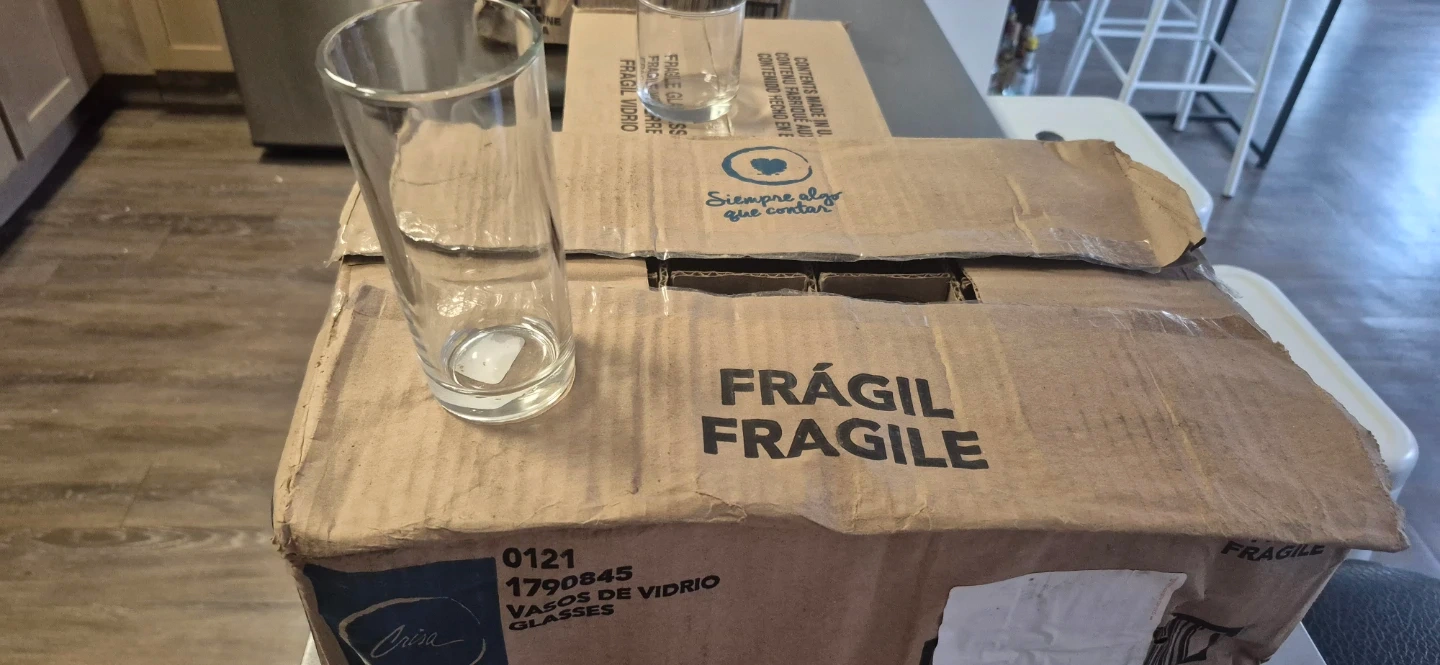 Selling a two of Crisa Vaso de Vidrio glasses. The box says 'Fragile' and 'Contents made in USA'. Perfect for everyday use!