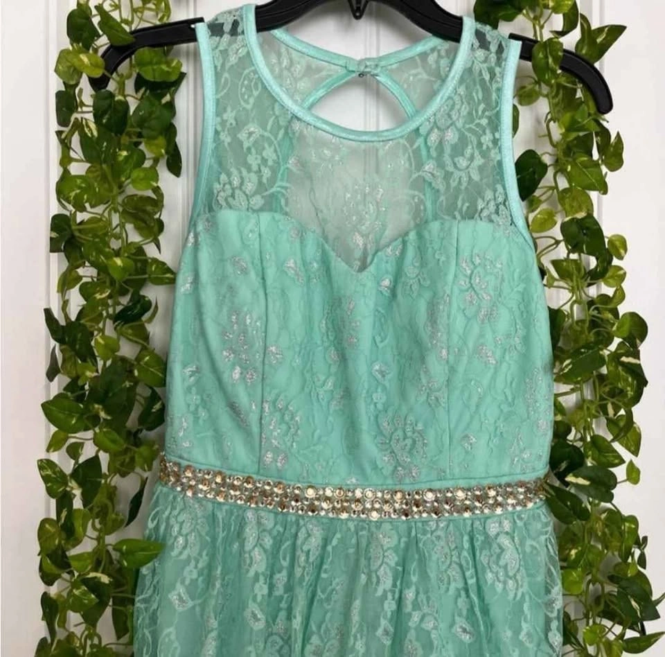 Turquoise lace dress, would go lovely for an event or party! Has beautiful lace detailing with glitter accents. Says size 9 but fits like a size 8/10. Comes from a smoke-free, pet free home ❤️