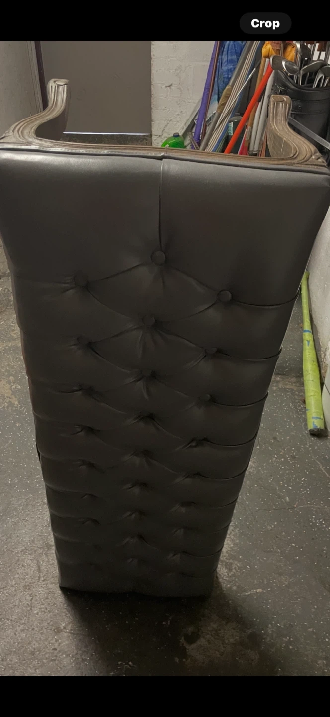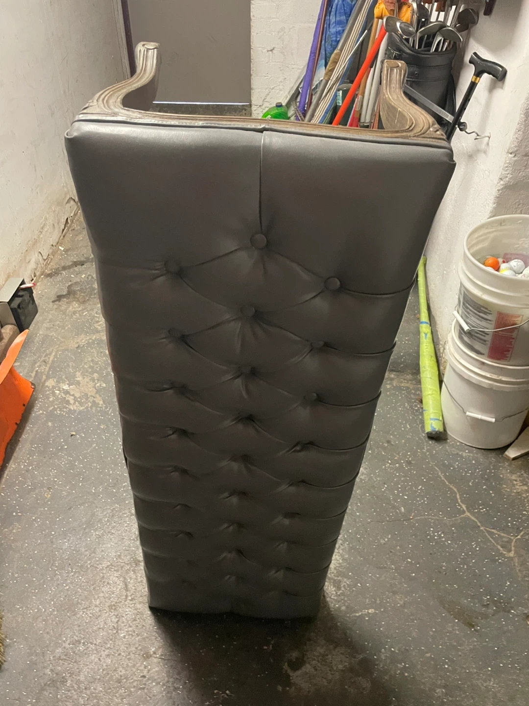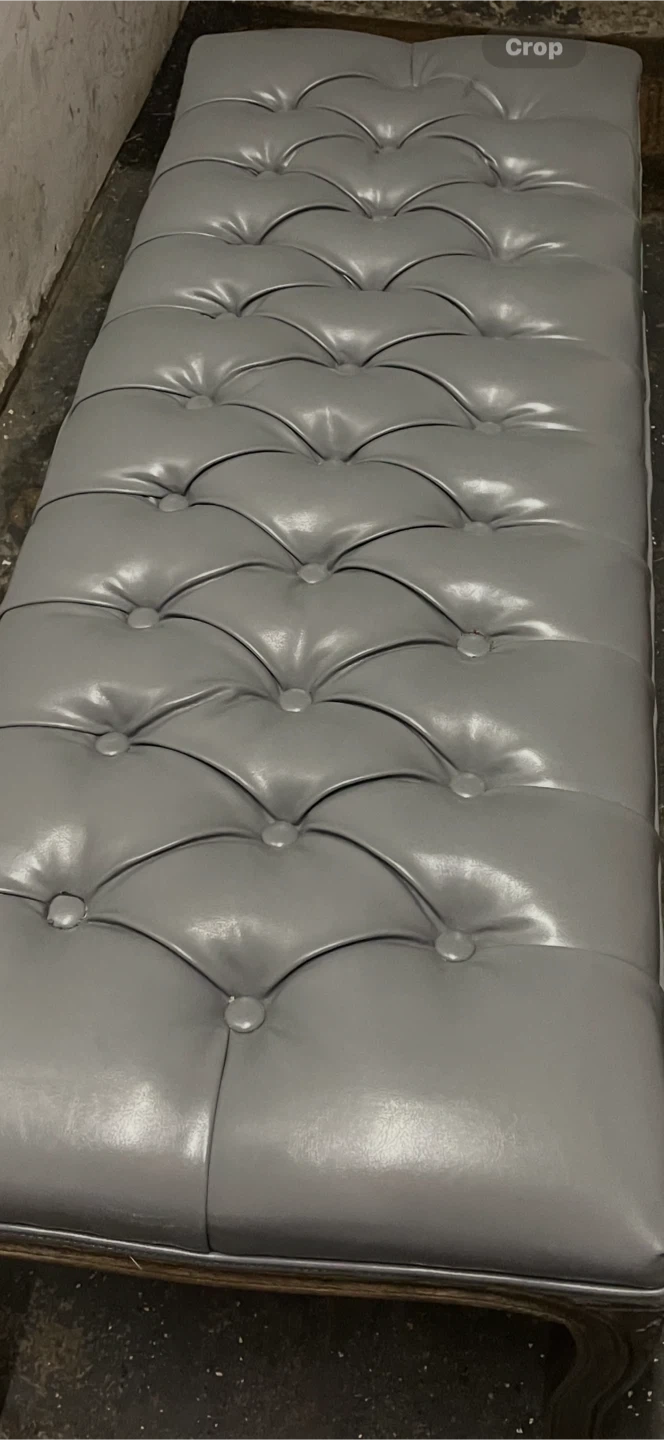 Selling a Kmax storage entryway bench with a tufted shoe rack. It's a wood window bench, perfect for a hallway entrance or bedroom corner. It's in gray color. Dimensions are approximately W-L7 x L-45 x H-16.