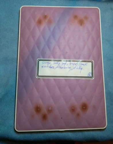 Good screen - may have very faint scratches. May have scratches on bezel area and/or back area. The material around bezel and back areas may get some stickiness over time, due to the type of material. There is nothing I can do about this. Some discoloring on back. Free case.