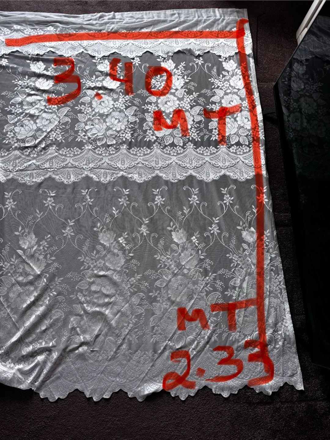 Selling a beautiful 2 piece of white floral lace curtain fabric. It measures approximately 3.40 meters in length and 2.33 meters in width. Perfect for adding a touch of elegance to any room!