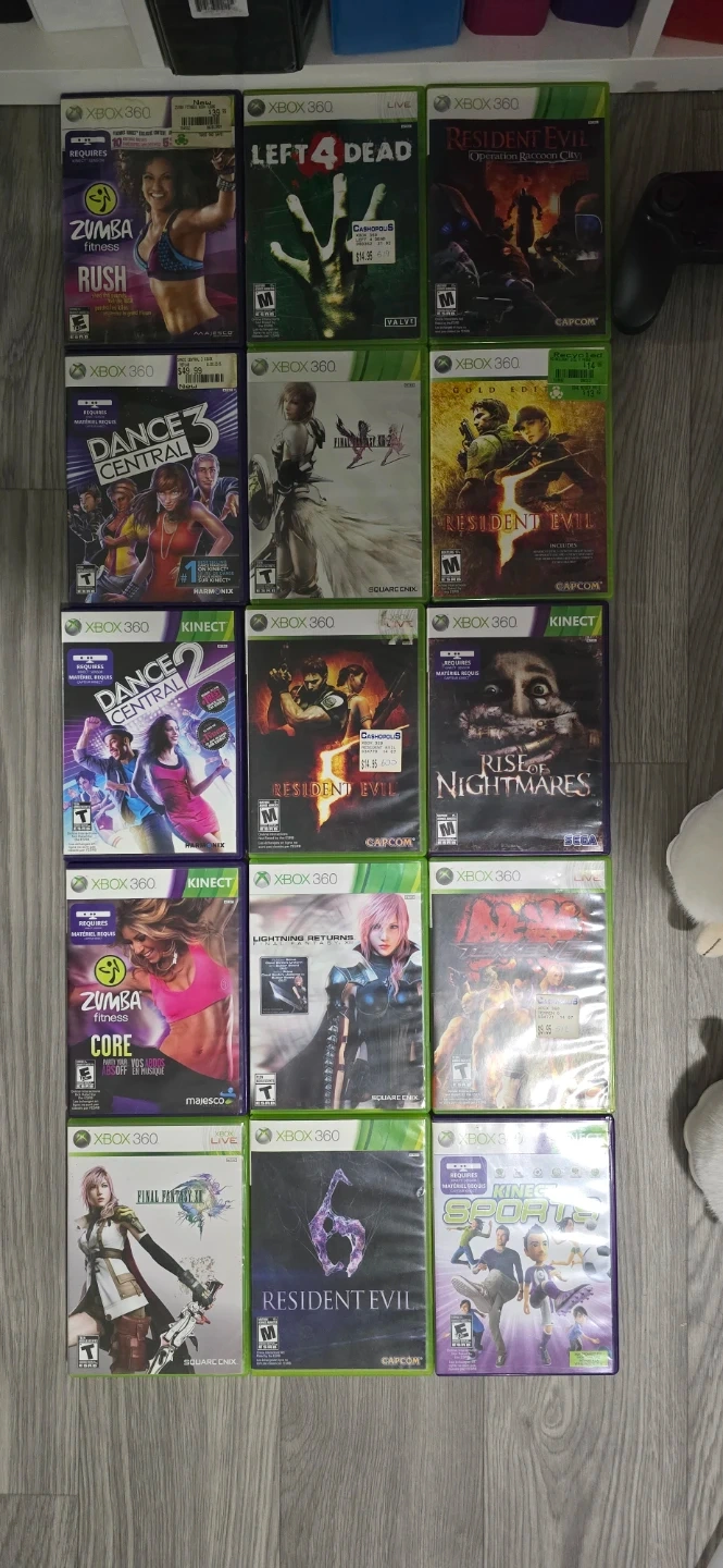 75Selling a collection of Xbox 360 games and controllers. Great for anyone looking to relive some gaming classics or expand their collection! Includes titles like Zumba Rush, Left 4 Dead, and various Resident Evil games. Also included are a few controllers to get you started