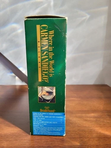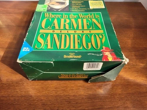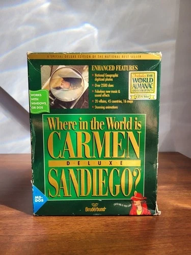 The Broderbund DOS version of Where in the World Is Carmen Sandiego? Deluxe Edition was released in 1992, featuring an updated interface, more animation, digitized photos, and spoken dialogue compared to earlier versions. This enhanced edition built upon the original 1985 release and its subsequent 1989 update, offering more clues, villains, countries, and music from the Smithsonian/Folkways Recordings to create a richer experience for players. Enhanced features: National Geographic digitized photos. Over 2500 clues. Fabulous new music and sound effects. 20 villains, 45 countries, and 16 maps. Stunning animations. Includes the World Almanac book of facts. Works with Windows or DOS.