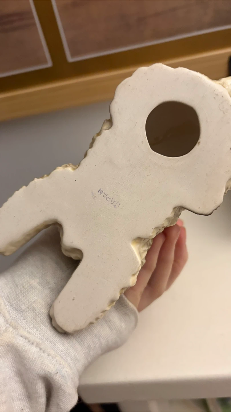 Selling a vintage ceramic dog figurine, marked as made in Japan. It's a charming piece that would look great on a shelf or desk. The figurine is in good condition, with a lovely textured finish.