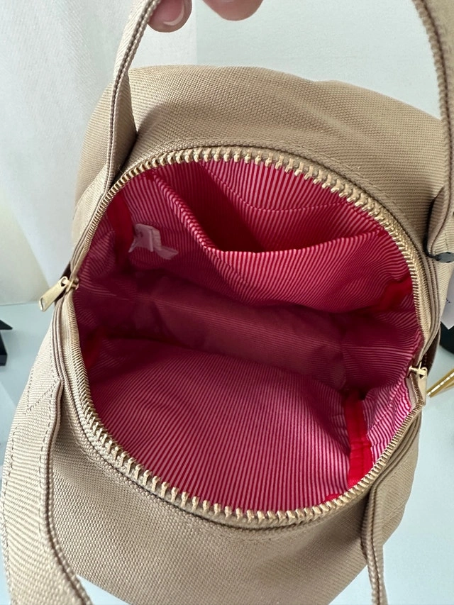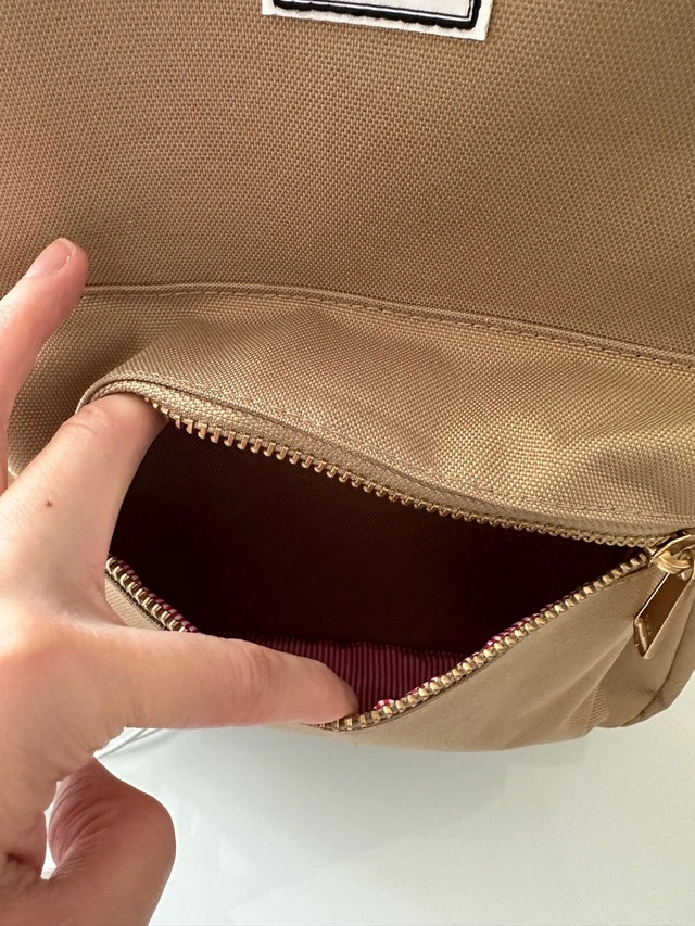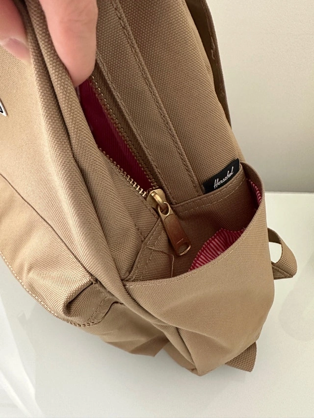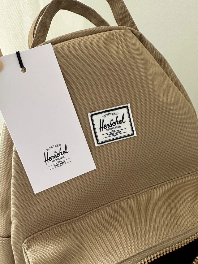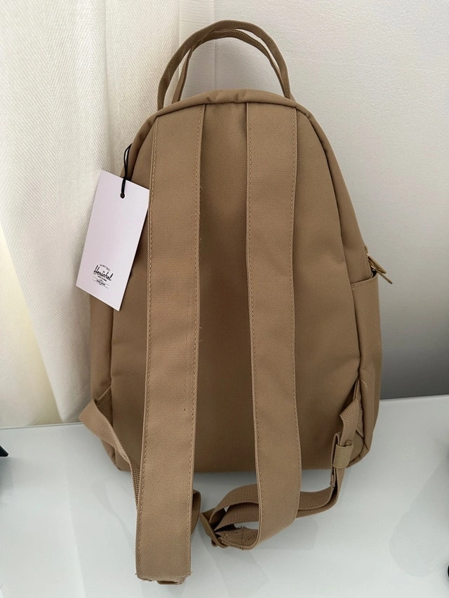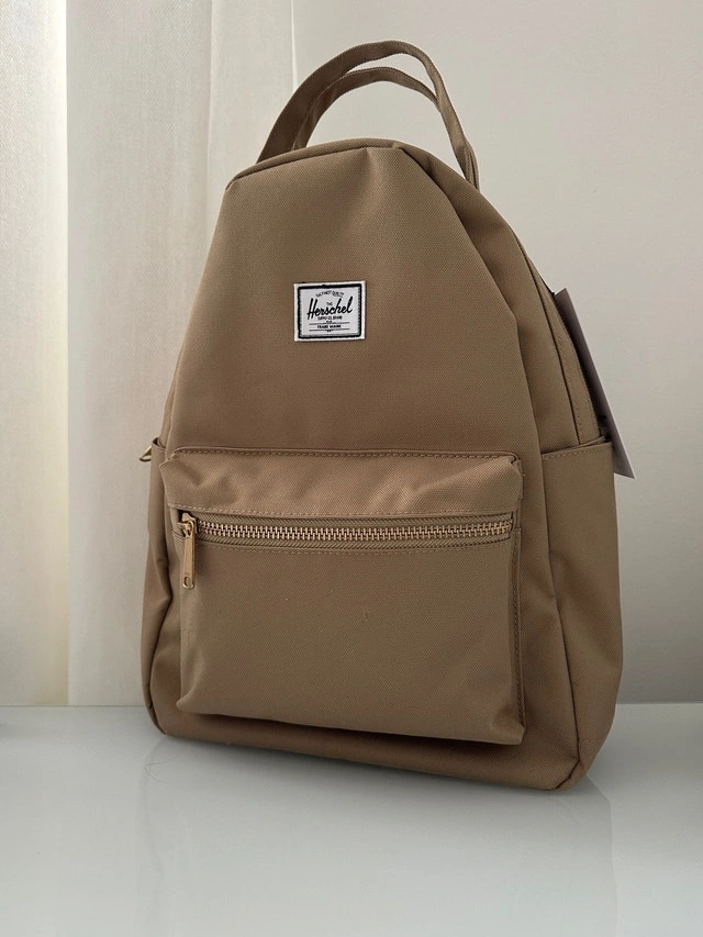 0- Herschel Nova in size Small - Light brown - New condition with tags still attached - 14.25'' (H) x 10.25'' (W) x 5'' (D) - Signature striped liner - Exposed metal zippers - Dual top carrying handles - Adjustable slim shoulder straps - Front pocket - Internal storage sleeve - Dual water bottle pockets