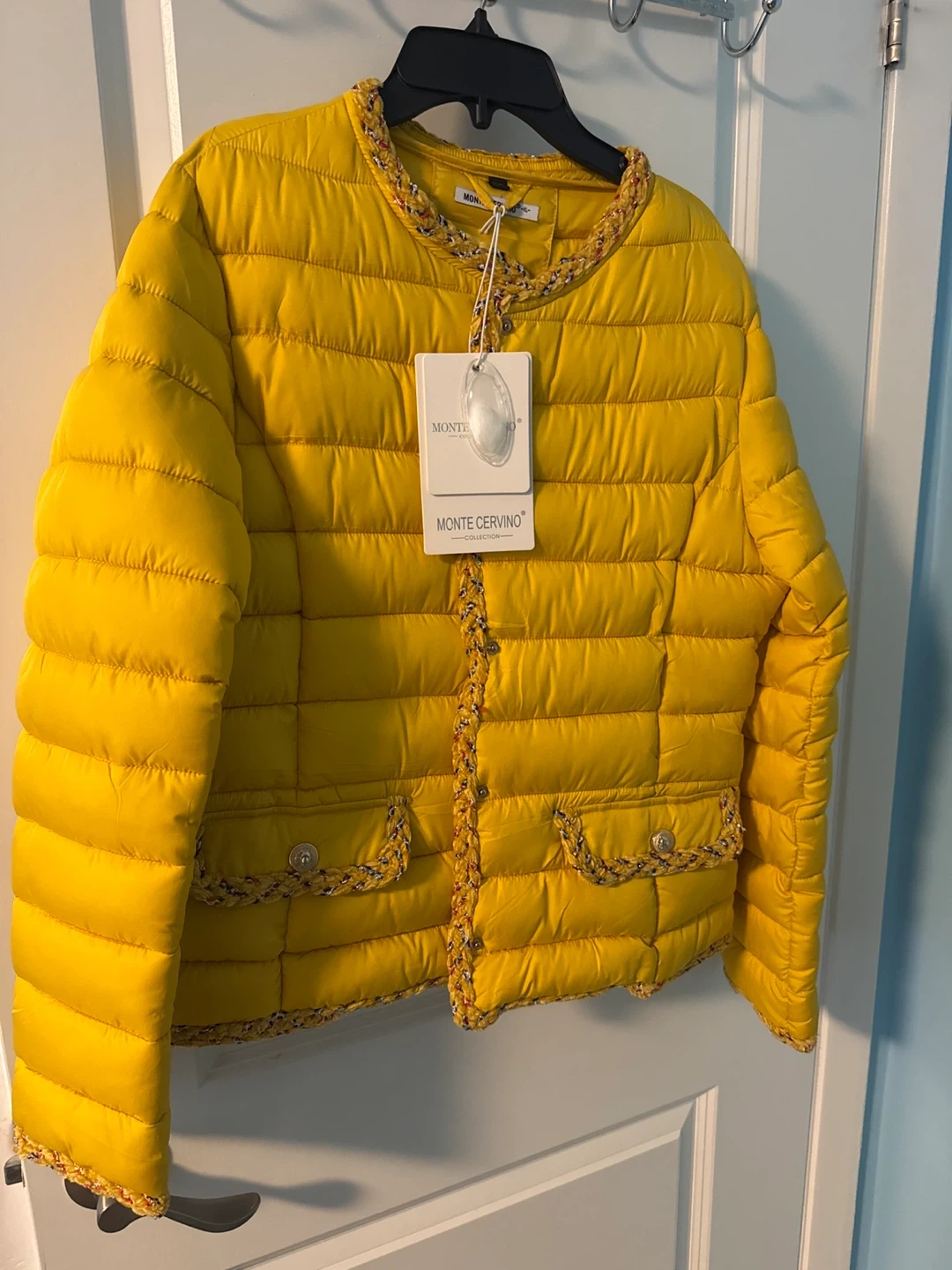 I'm selling a bright yellow puffer jacket from Monte Cervino! It's in great condition and ready to keep you warm and stylish. The jacket features a unique braided trim around the collar and pockets, adding a touch of elegance to the classic puffer design