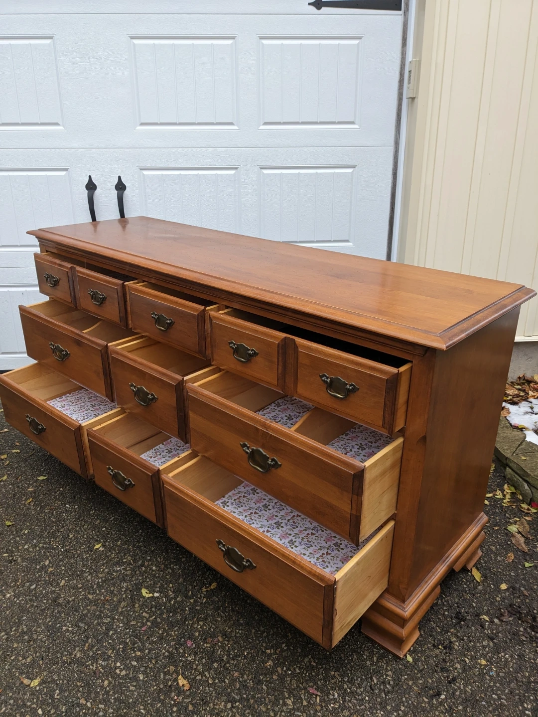 This Vilas 9 drawer triple dresser features spacious dovetailed drawers that all open and close smoothly and are in like new condition inside.
