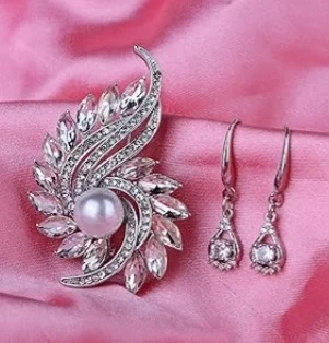 Here's a lovely set of earrings! The brooch has a unique floral design with crystal accents, and the earrings complement it perfectly. The earrimgs backings are Sterling silver dangling style