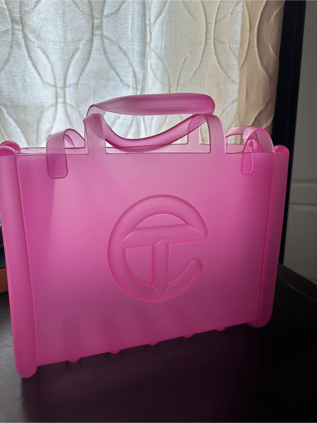 This is a gently used Melissa x Telfar shopping bag in a fun pink jelly material! It's a unique and stylish bag that's sure to turn heads. Perfect for adding a pop of colour to any outfit