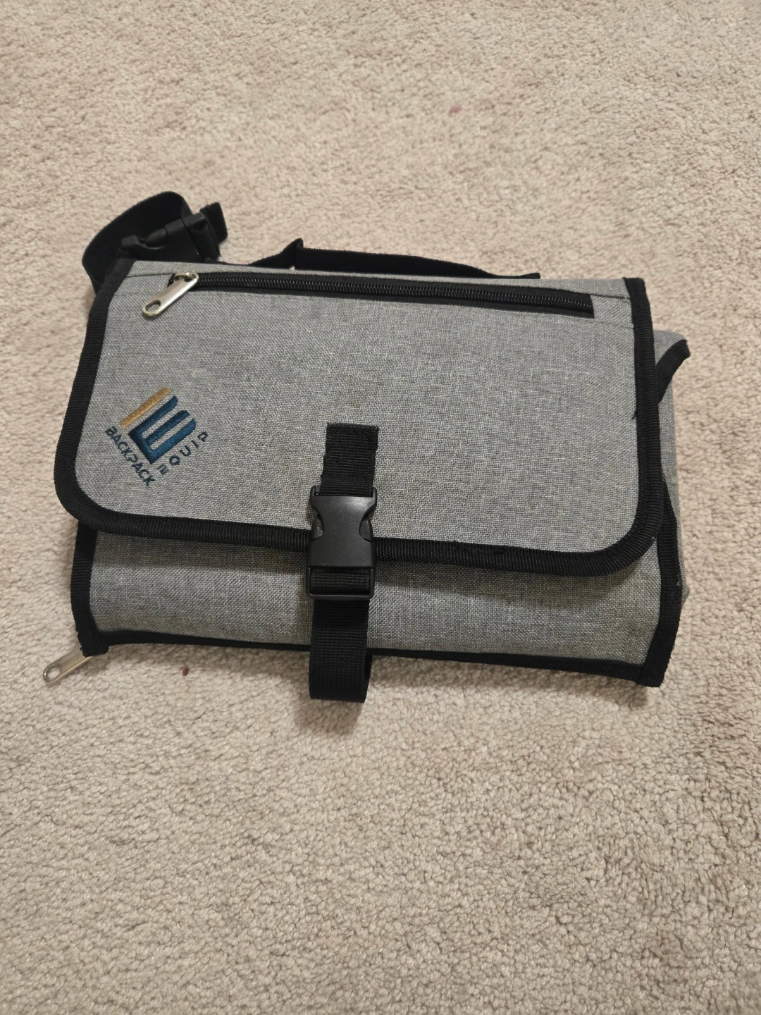 Selling a portable changing pad from Backpack Equip! It's in great condition and perfect for on-the-go diaper changes. It features a grey colour with black trim, and several mesh pockets for holding diapers, wipes, and other essentials. Easy to fold up and carry!