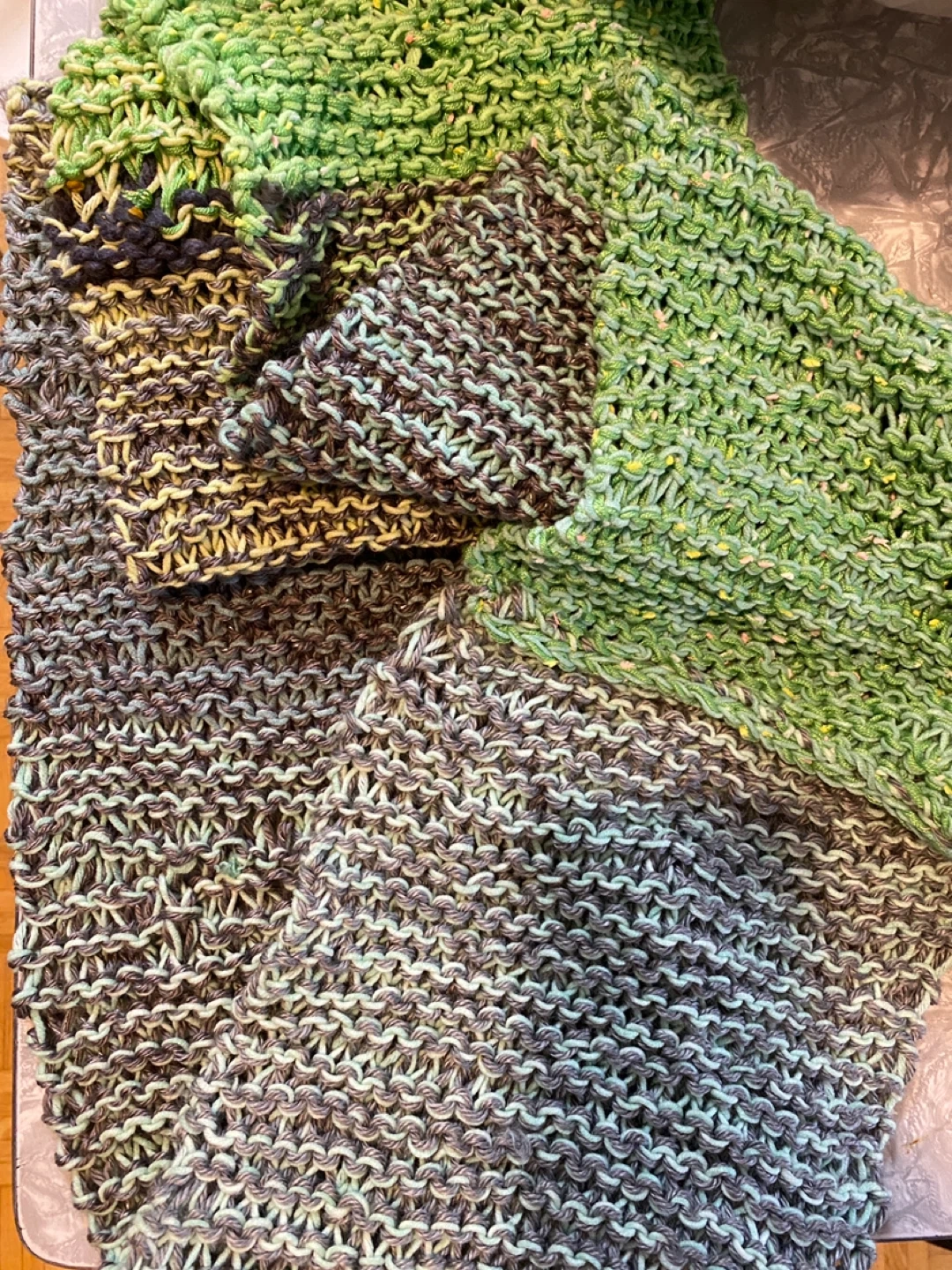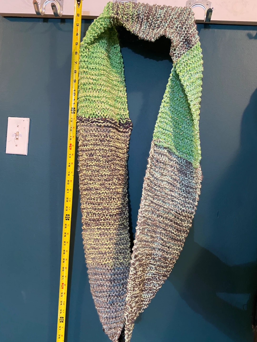 Beautiful handmade knitted infinity scarf in a blend of green and grey tones. It's a unique piece, perfect for adding a touch of warmth and style to your outfit. The scarf is long and can be wrapped multiple times for extra coziness for the cold weather!