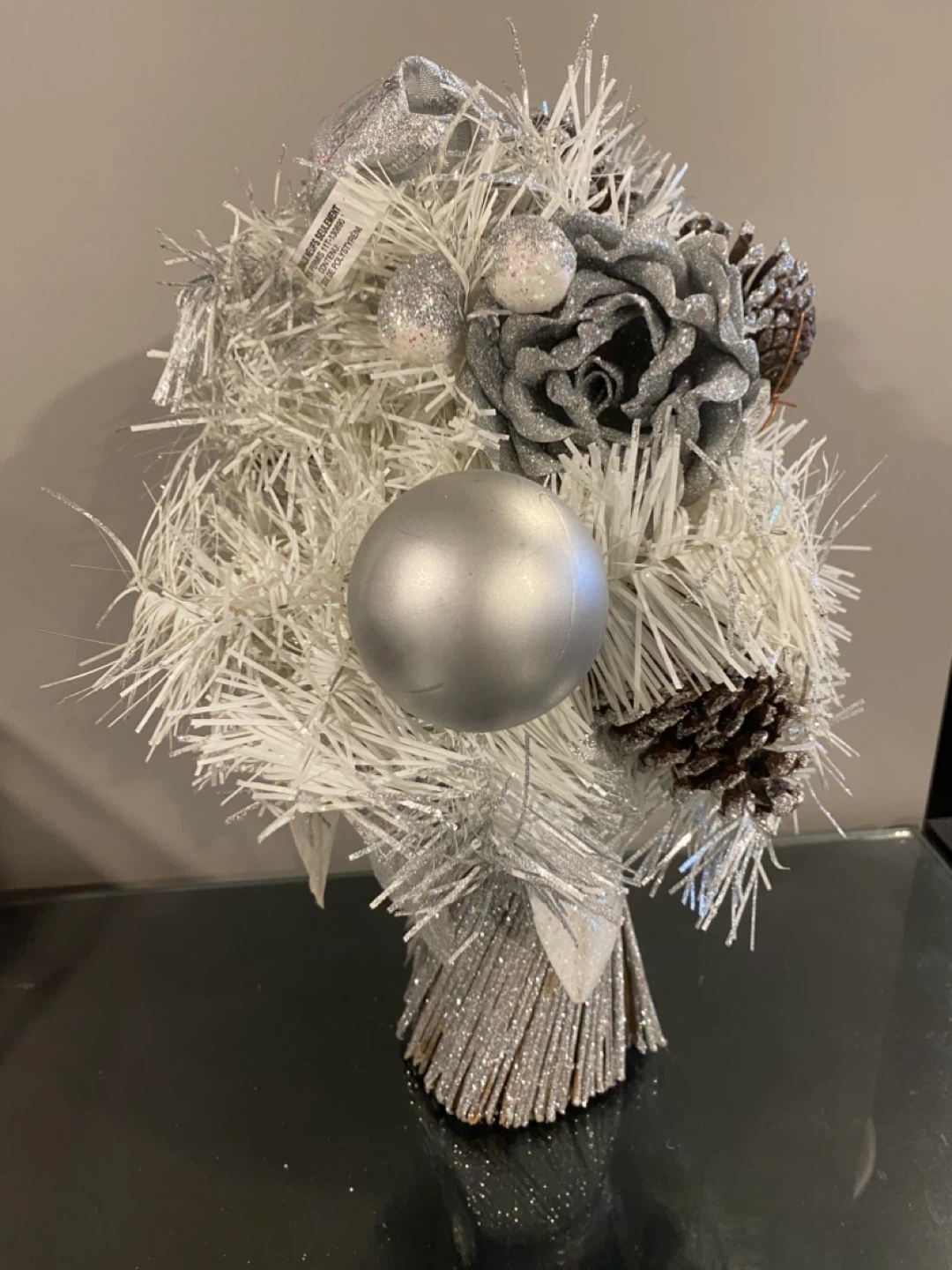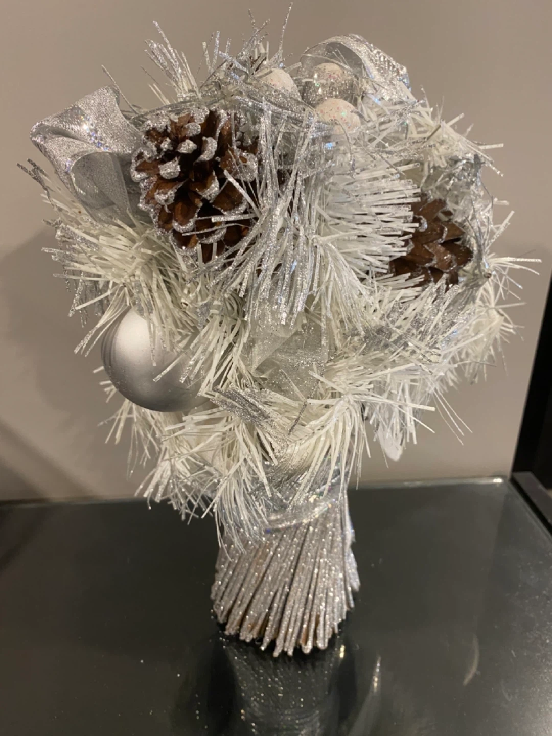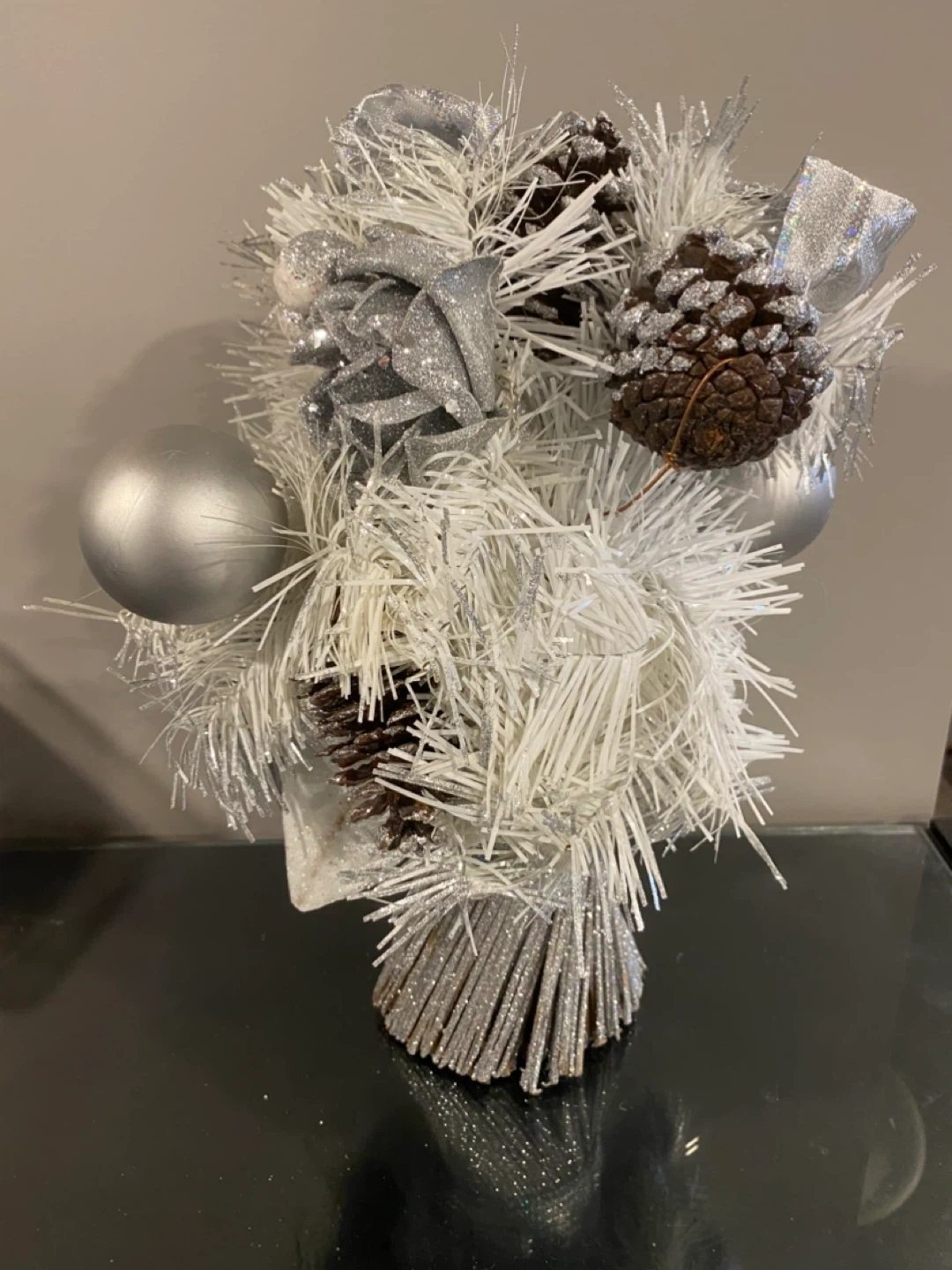 A lovely silver Christmas decoration to brighten up your home during the holidays! It features pine cones and silver ornaments.