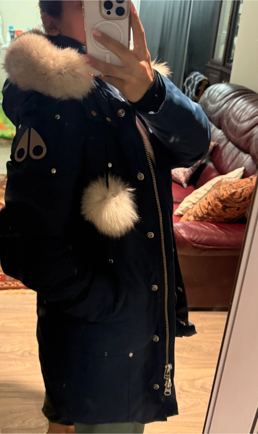 Selling a stylish Moose Knuckles down parka in a beautiful blue color! This parka is perfect for staying warm during those cold Canadian winters. It features a fur-trimmed hood and the iconic Moose Knuckles logo on the sleeve.