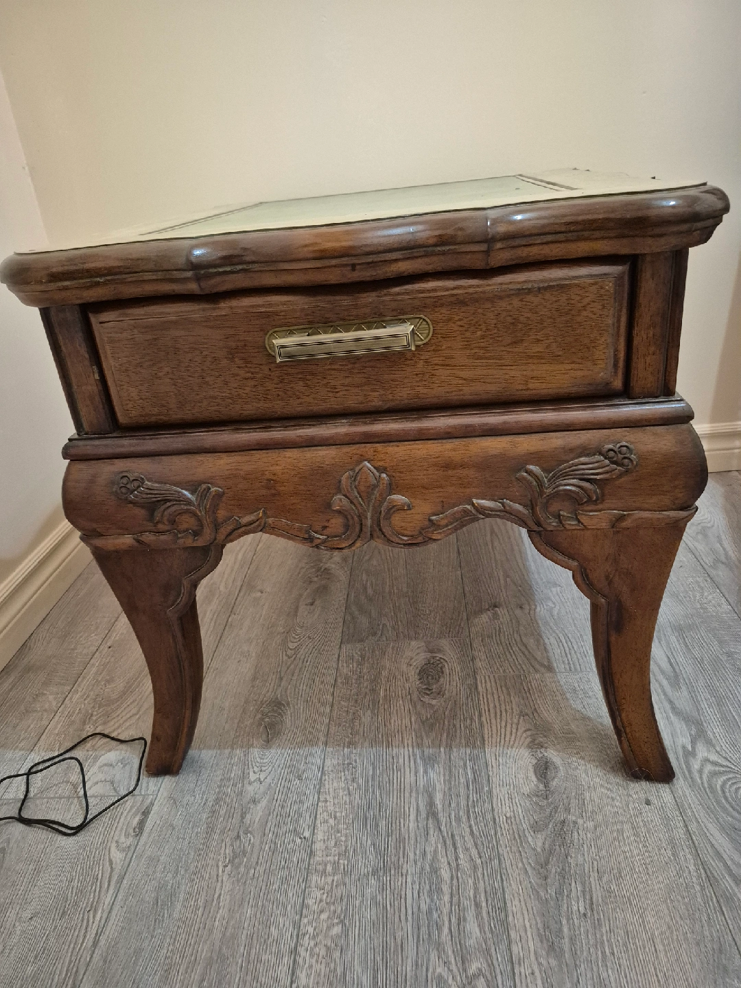 Selling a lovely vintage wood end table! It features a drawer and ornate carved details. It would be a great addition to any room!