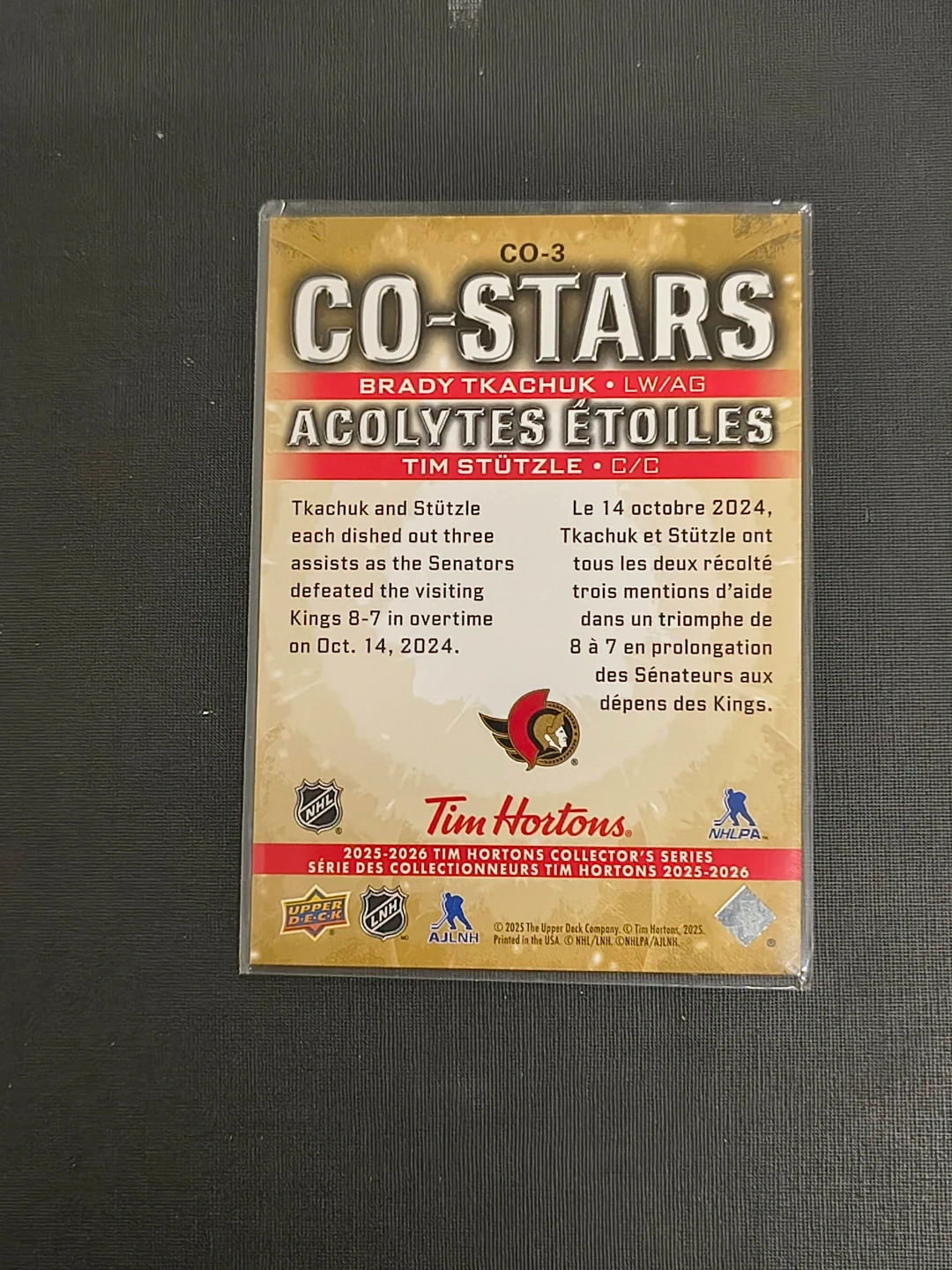 Selling a Brady Tkachuk & Tim Stützle "Co-Stars" hockey card from the Upper Deck Tim Hortons 2023-2024 Collector's Series! It features a cool design with both players from the Ottawa Senators.