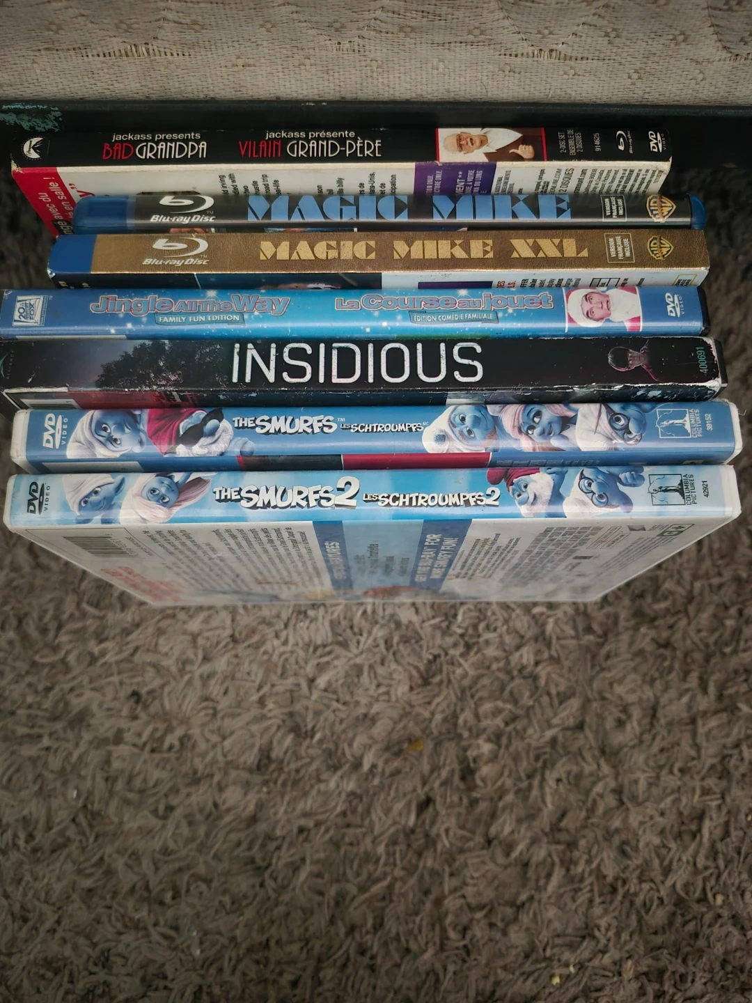 Selling a collection of DVDs including: - Jackass Presents Bad Grandpa - Magic Mike XXL (Blu-ray) - Jingle All the Way Family Fun Edition - Insidious - The Smurfs - The Smurfs 2