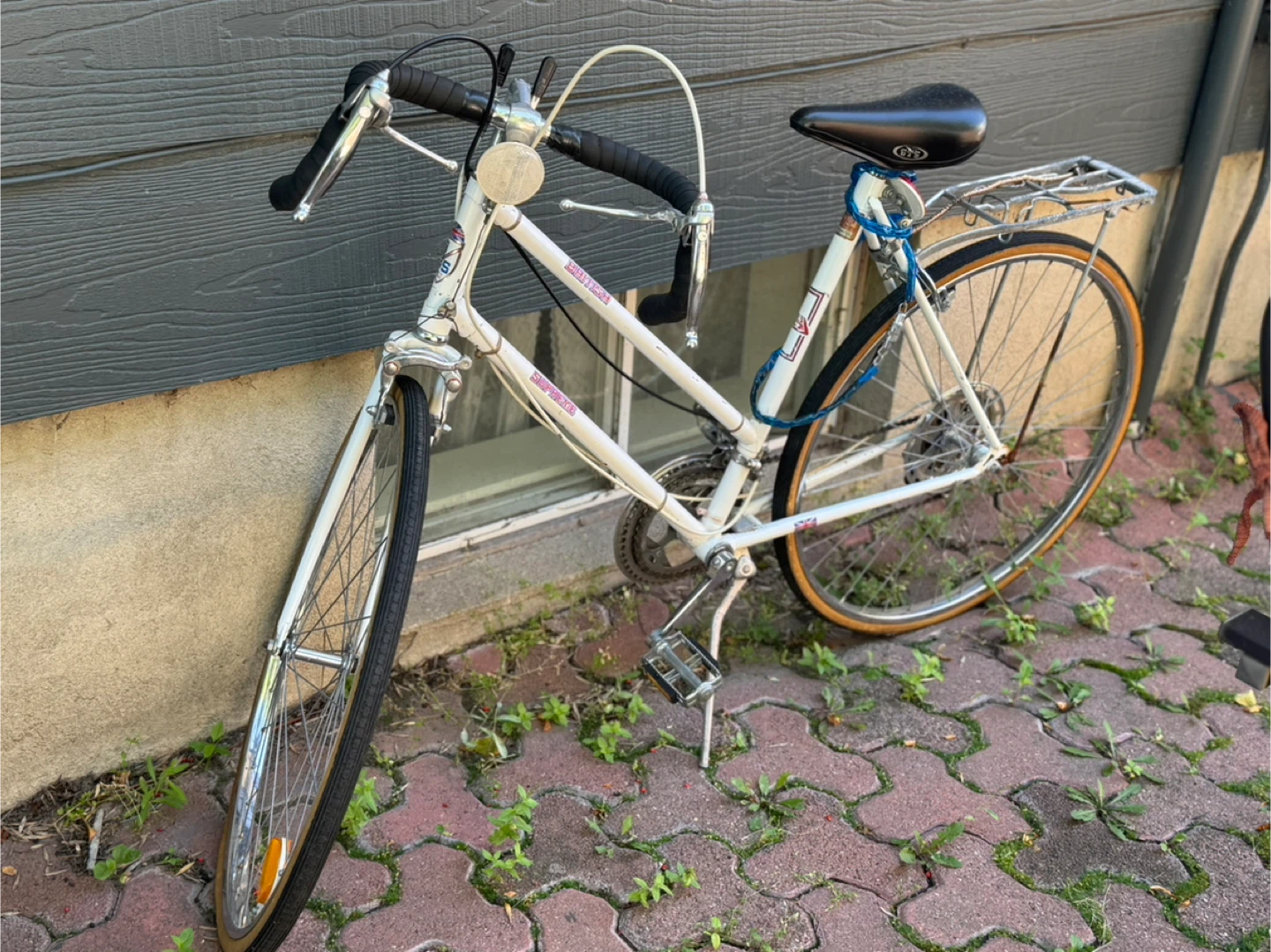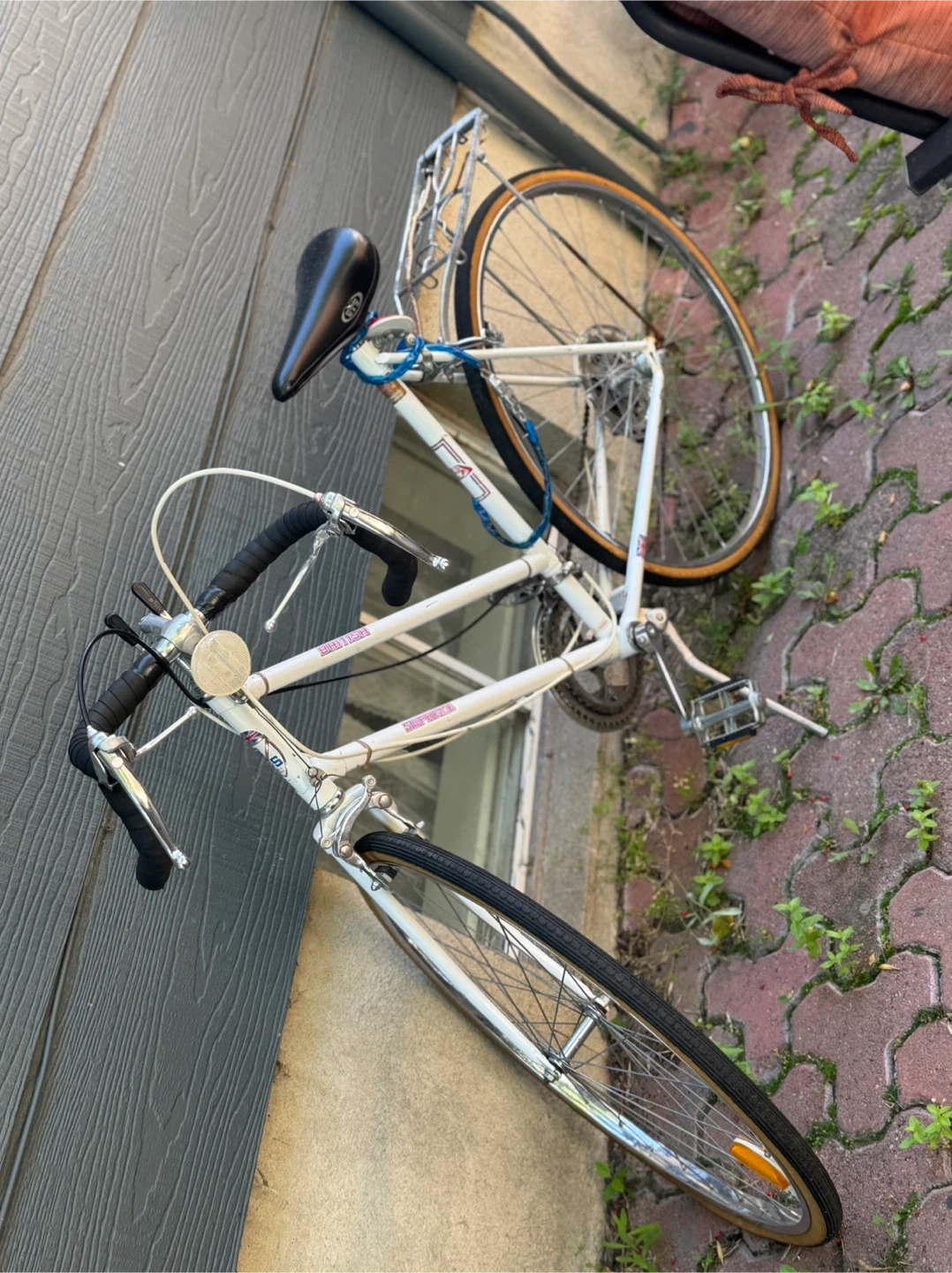 Selling a vintage road bike in white. It's a classic ride that's ready for a new home. Perfect for cruising around town or enjoying a leisurely ride in the park.
