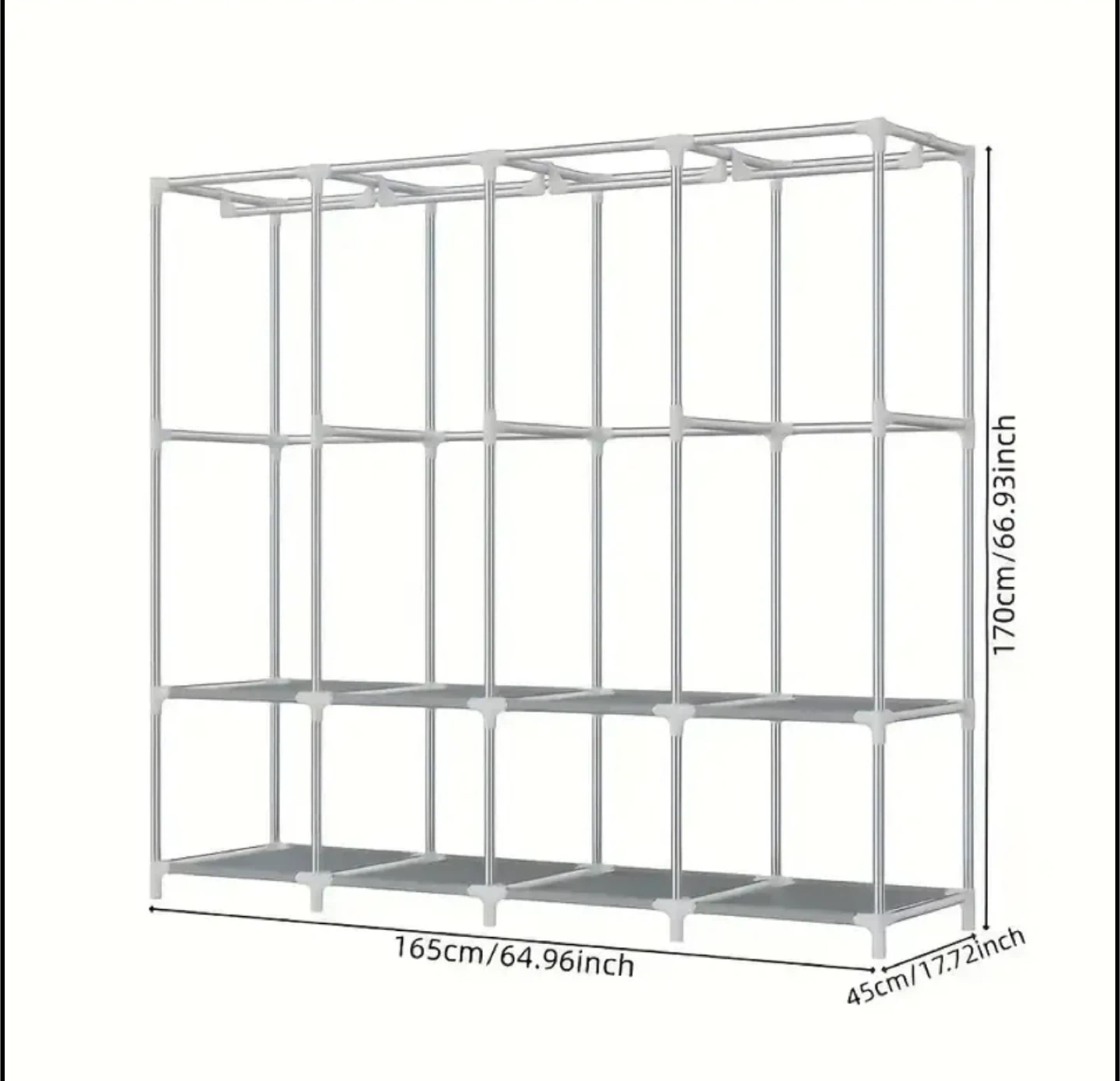 Looking to keep your clothes organized? This portable wardrobe closet is just what you need! It's black and measures approximately 67 inches tall, 65 inches wide, and 17.7 inches deep. Perfect for adding extra storage space in any room.