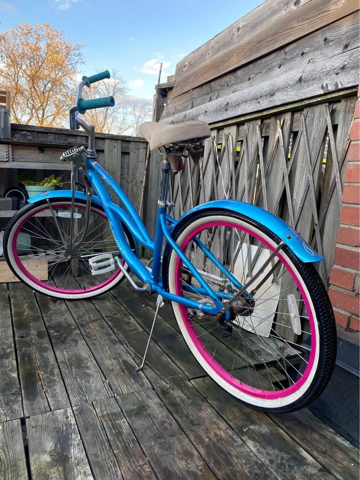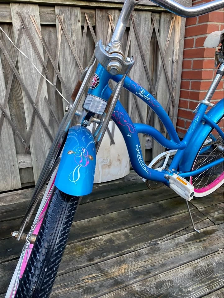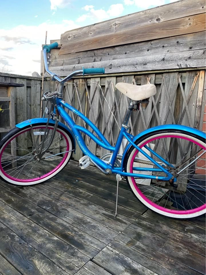 Catch everyone’s eye with this beautiful Schwinn Ruler Cruiser bike! Featuring a unique blue and pink color scheme, elegant pinstriping, and classic whitewall tires, this bike is a perfect blend of style and comfort for casual rides around town or the beach.