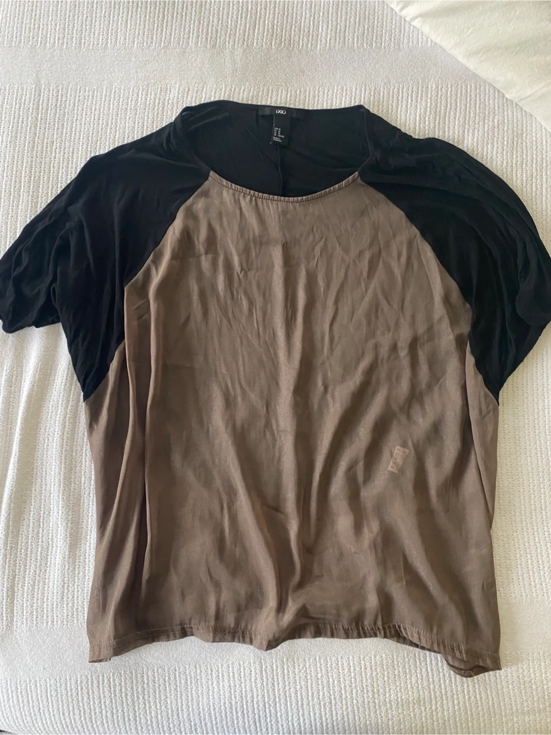 I-XIU (I bought this in Asia) brand. Flowy t-shirt. The olive section (front) is semi-transparent.