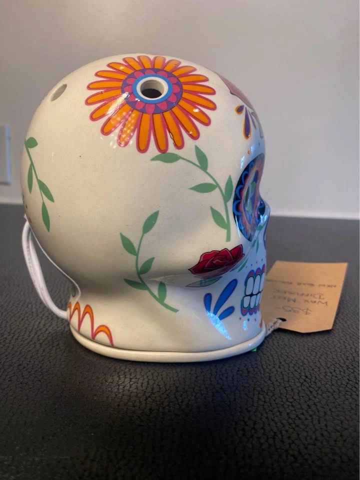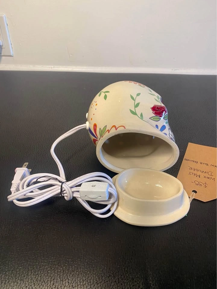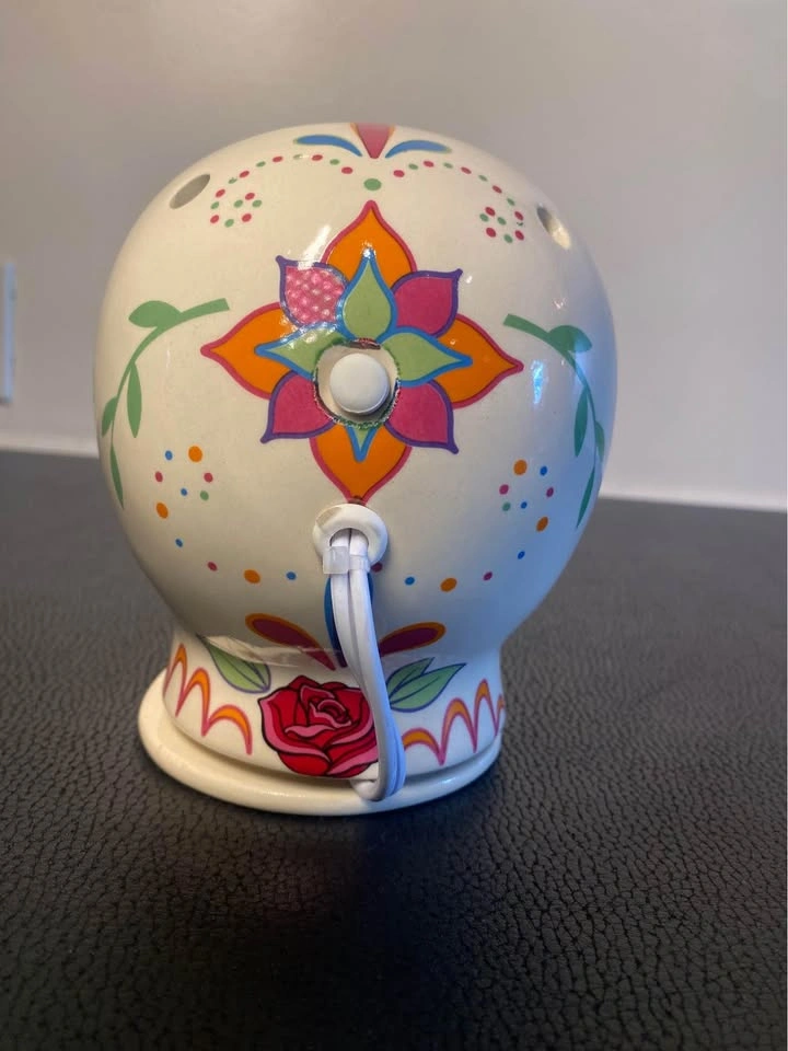This eye-catching electric wax melt burner combines functionality with festive charm, crafted in the shape of a traditional Mexican sugar skull. The vibrant, colorful detailing is reminiscent of Dia de los Muertos artistry, featuring intricate floral and geometric patterns that make it a striking decor piece even when not in use.