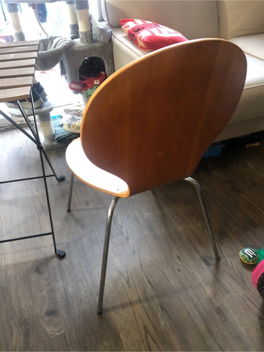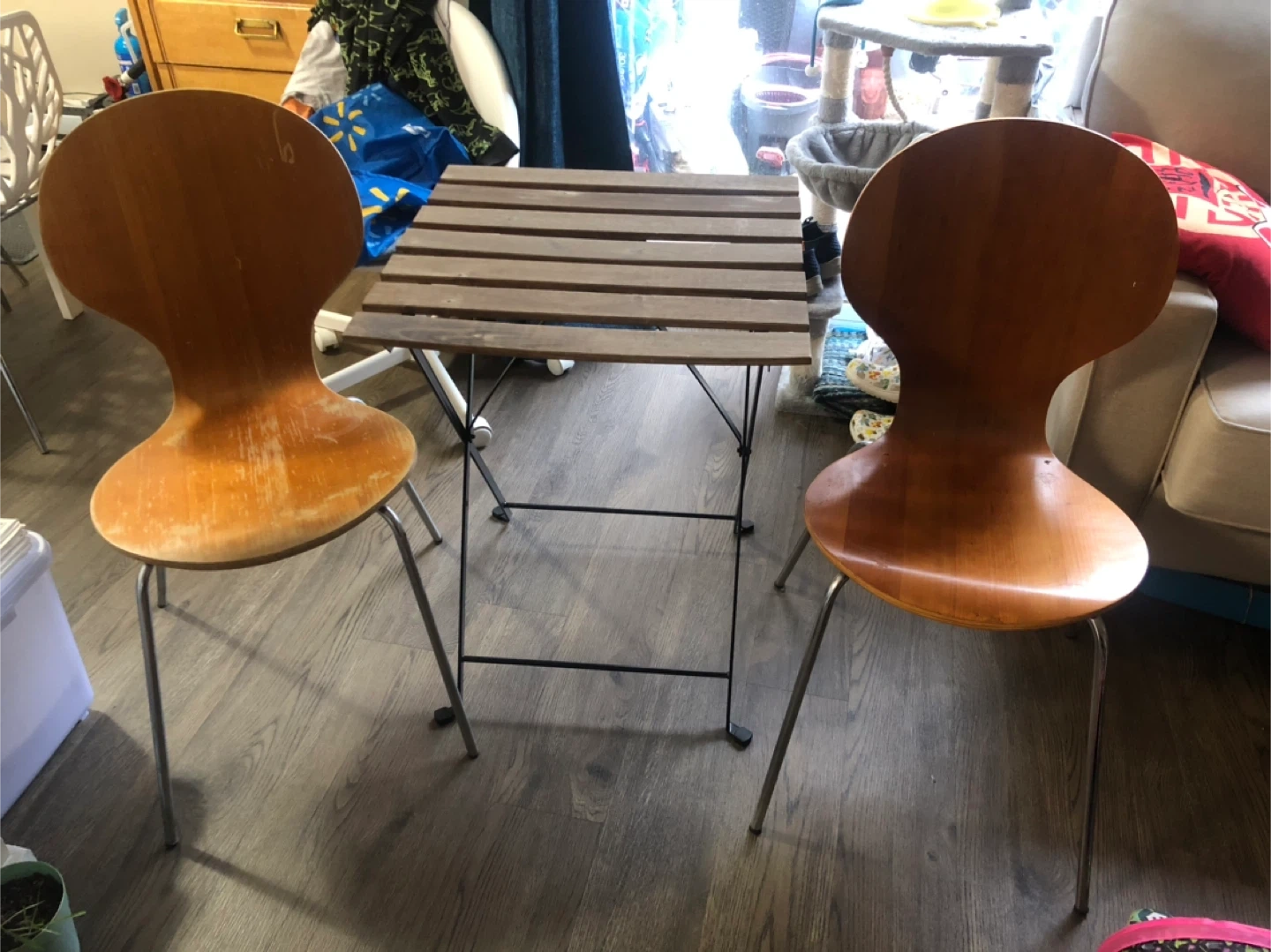 Selling a wooden table with two matching chairs. It's a cute set that would be perfect for a small space or balcony. The table is foldable for easy storage. The chairs have a unique rounded back design and metal legs. One chair need a little vanish and look new again $30 for all 3 thanks