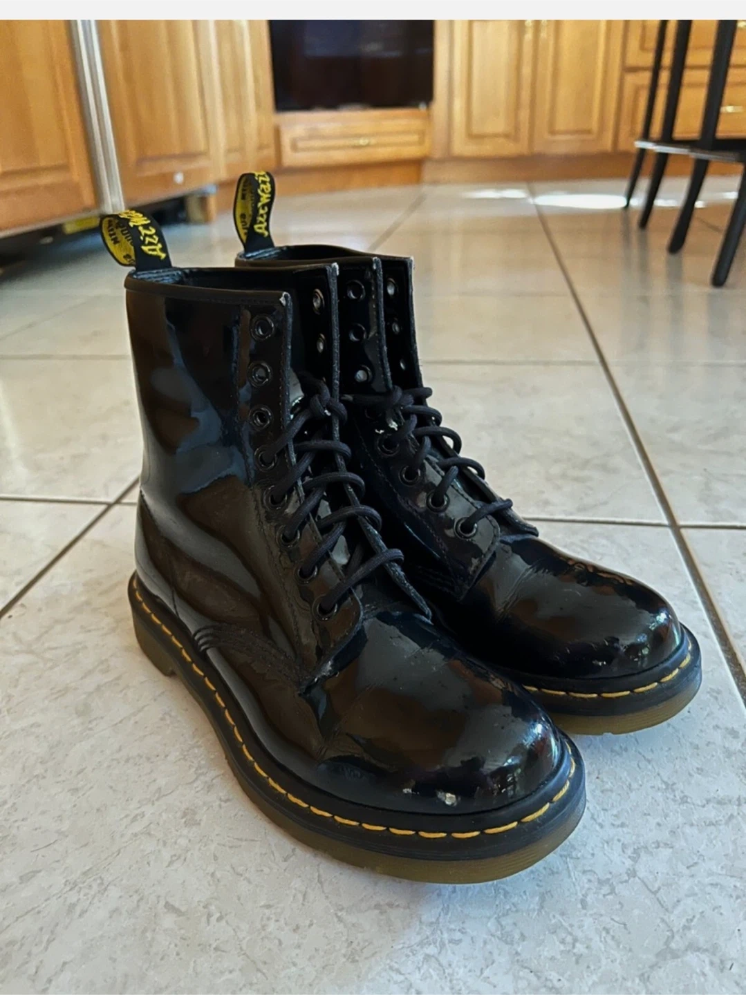 Selling a pair of Dr. Martens 1460 boots in black patent leather. These are a classic style and have a glossy finish. They show some signs of wear, but still have lots of life left!