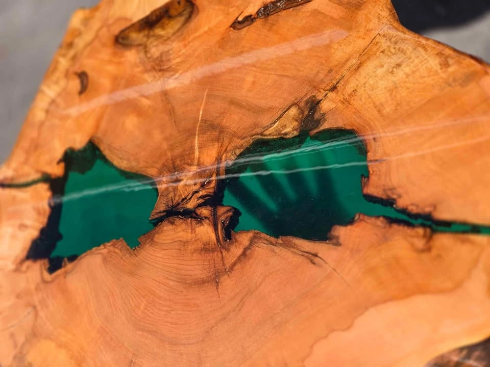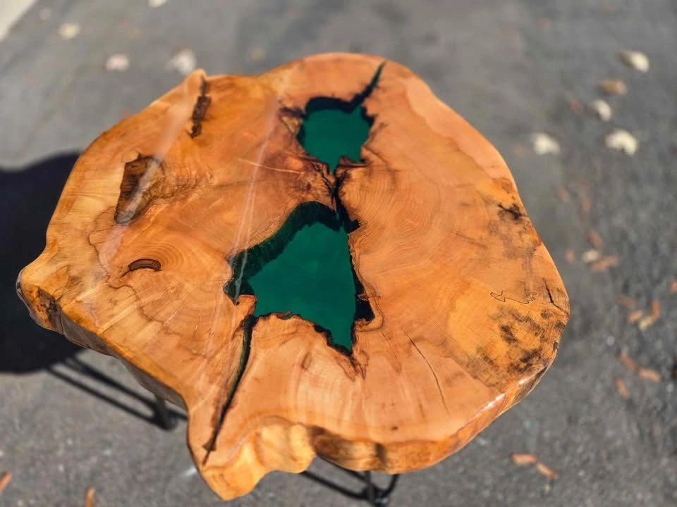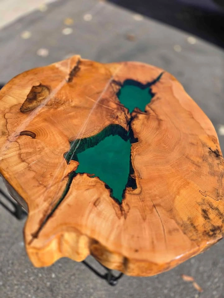This One of a kind piece is looking for its forever home; this maple cookie cut measuring 25 inch by 26 inches is a stunning piece of decor that will surely brighten any space. This side table was created with transparent Jade epoxy and a bartop finish; when the sunlight hits this beauty it has a shine like no other. This tabletop comes with a set of 16 inch hairpin legs. Please enquire if interested. Thankyou