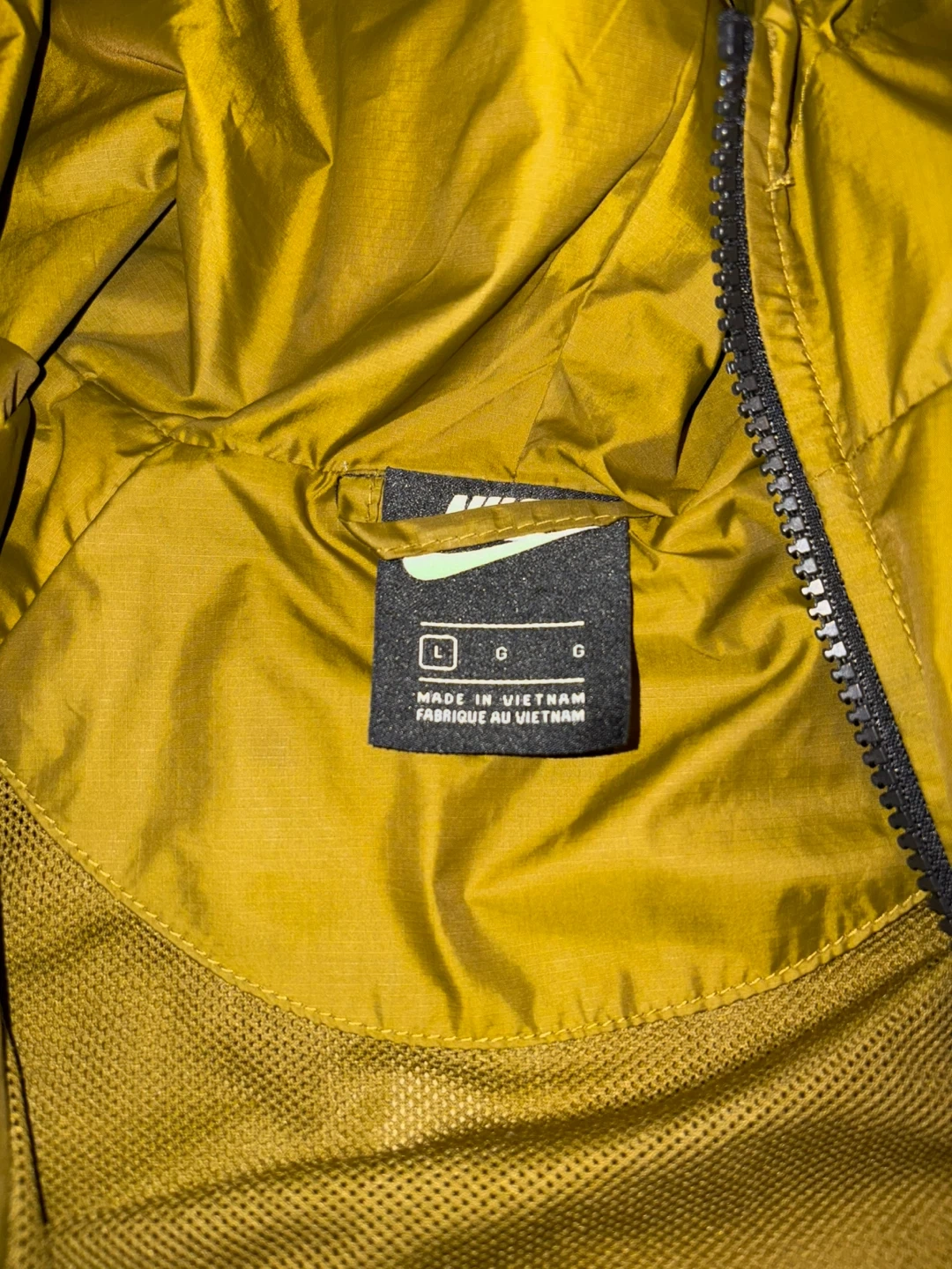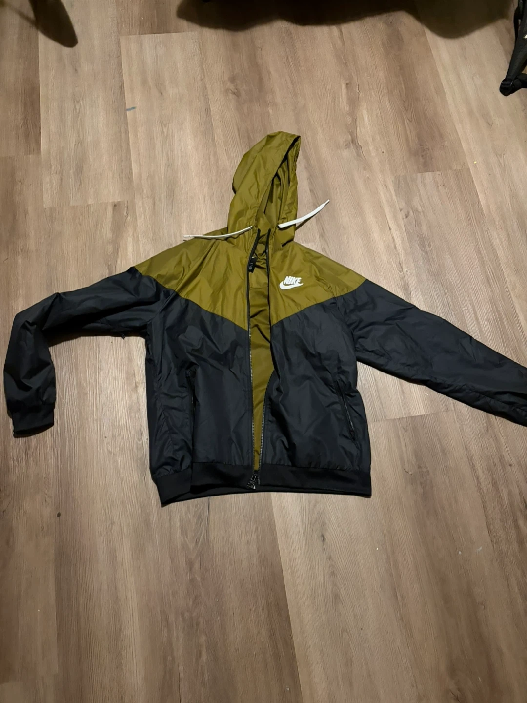 Selling a Nike windbreaker jacket in size L. The jacket is a stylish combination of black and olive green. It features the iconic Nike logo. Perfect for those breezy days!