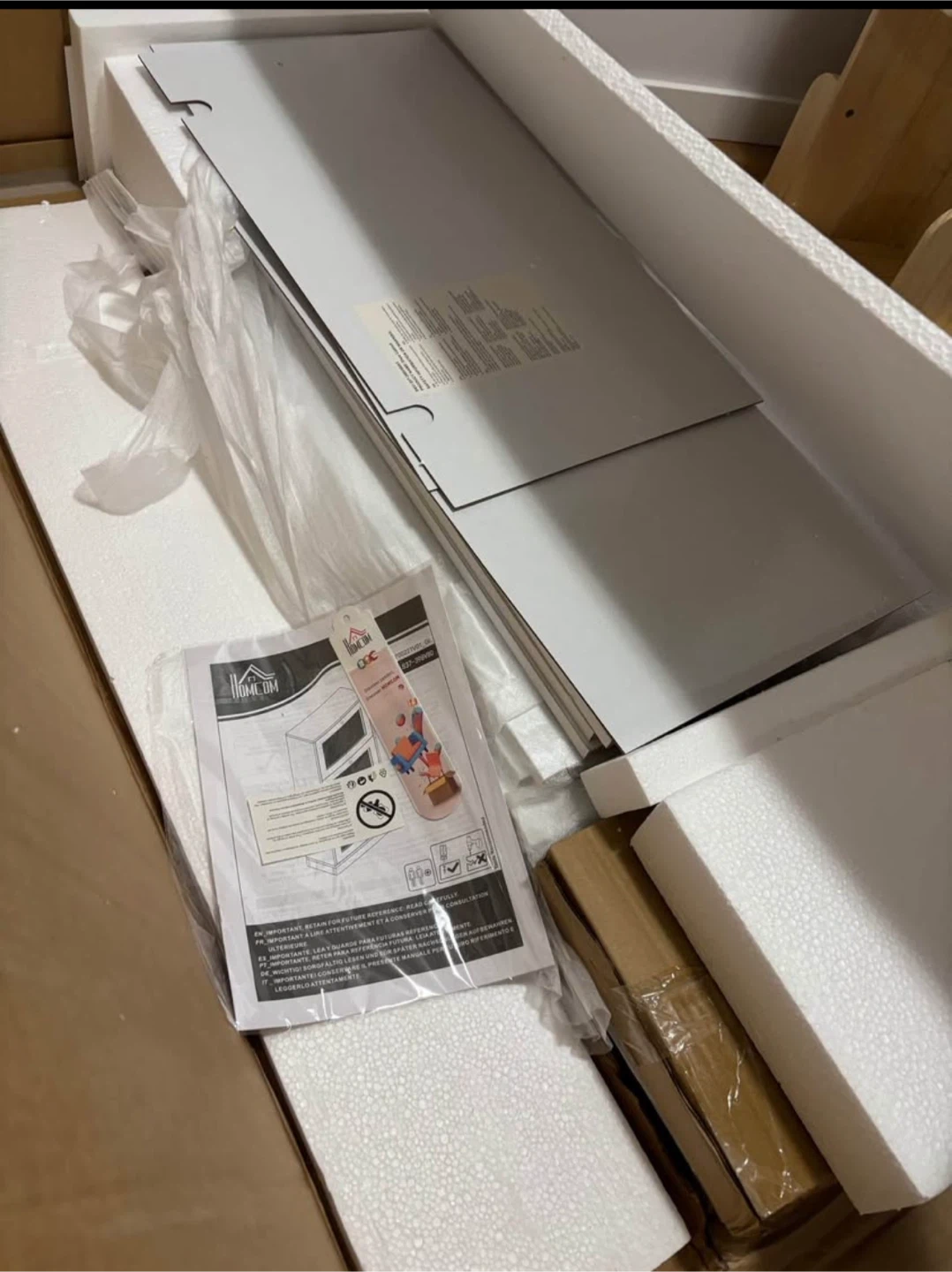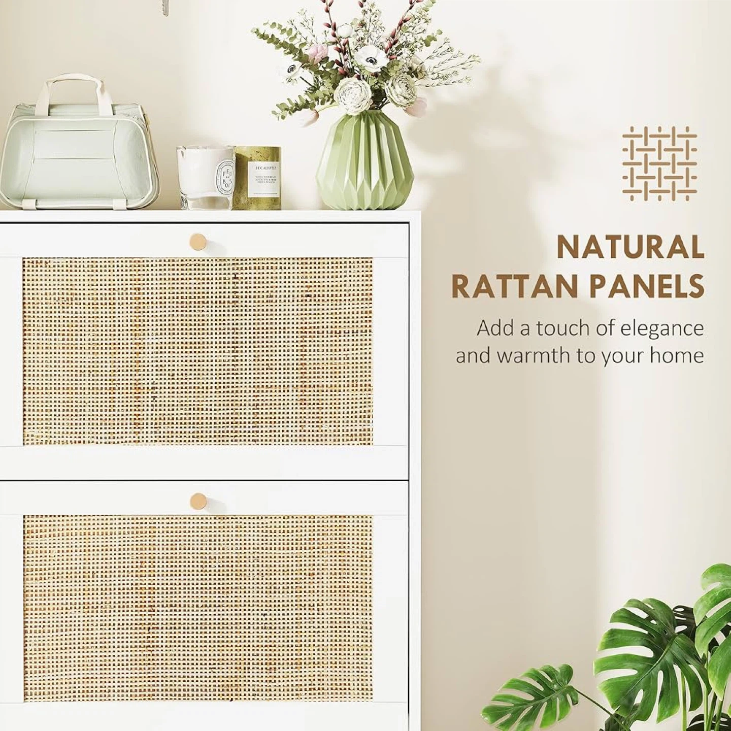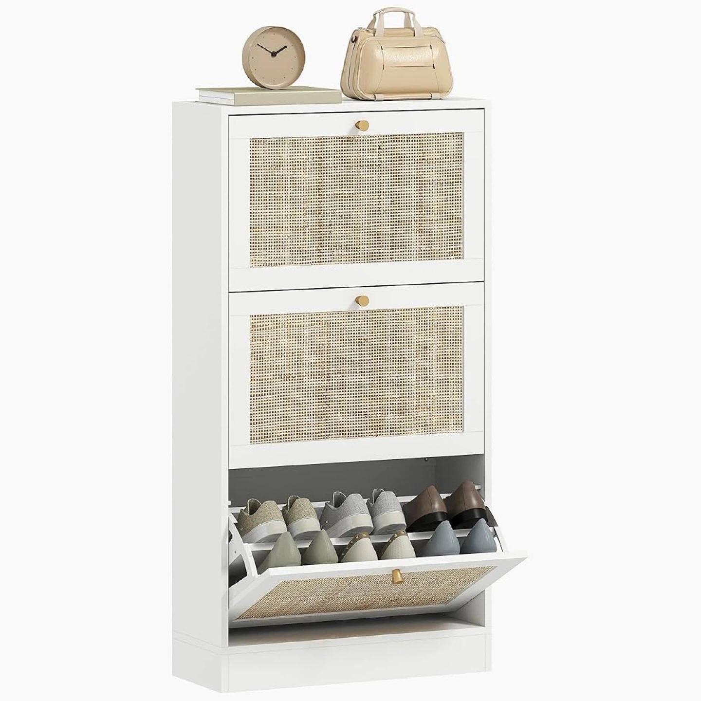 Selling a HOMCOM shoe cabinet in great condition! It's white with a rattan design on the doors. It can hold 12-18 pairs of shoes across its 3 spacious compartments.