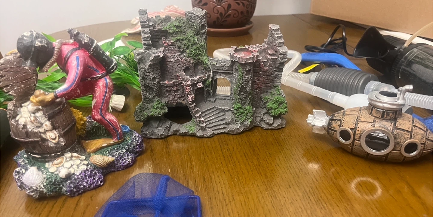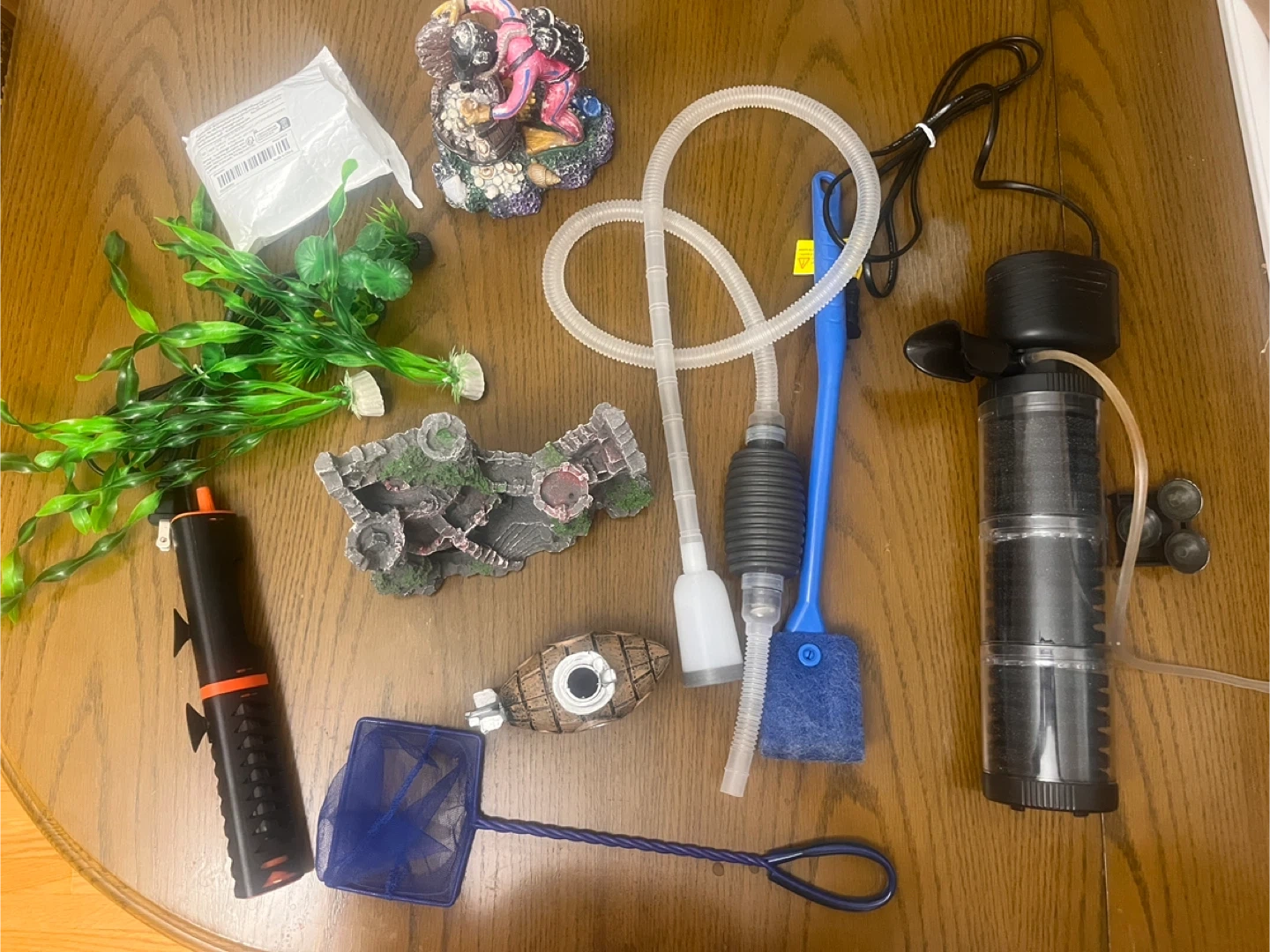 Selling a used fish tank comes with reusable filter, heater, plants and aquarium deco items It's in good condition and ready for a new home for your aquatic friends