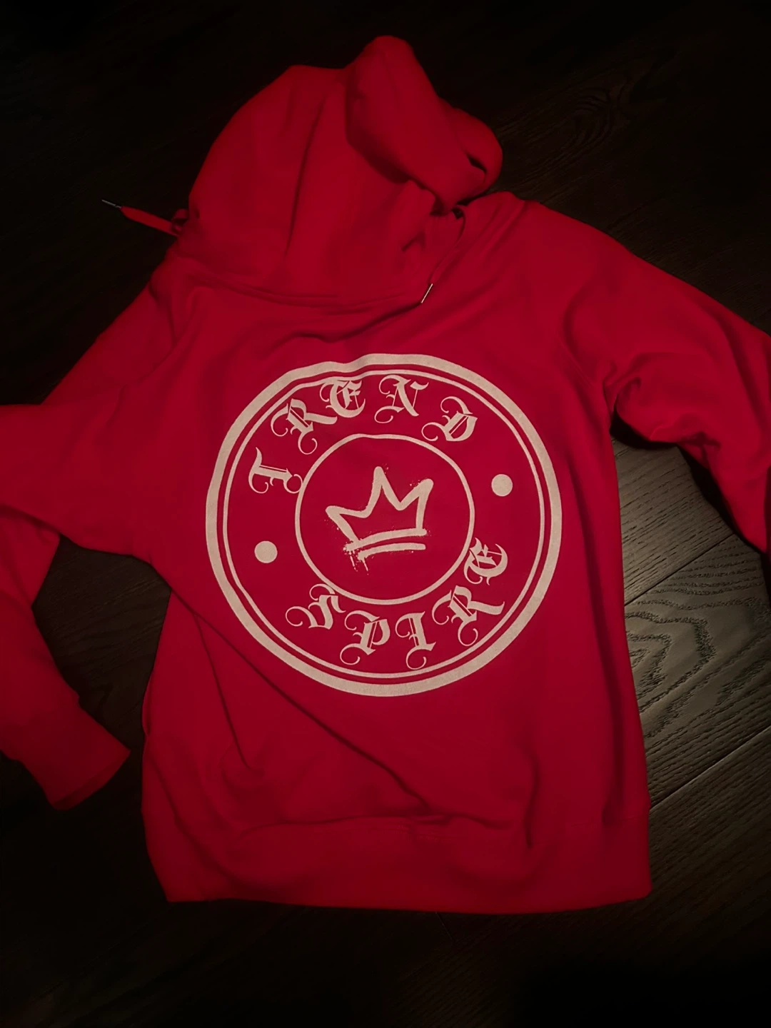 18Selling a trend spire hoodie in red! The design features a crown inside a circular emblem on the back. It's in great condition and ready for a new home