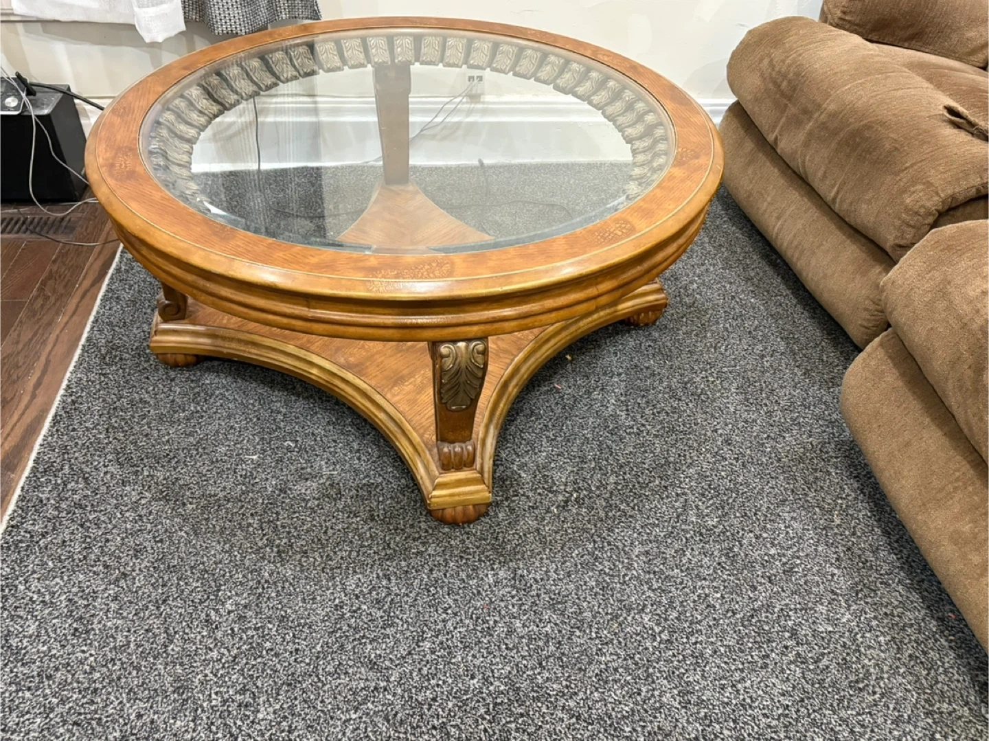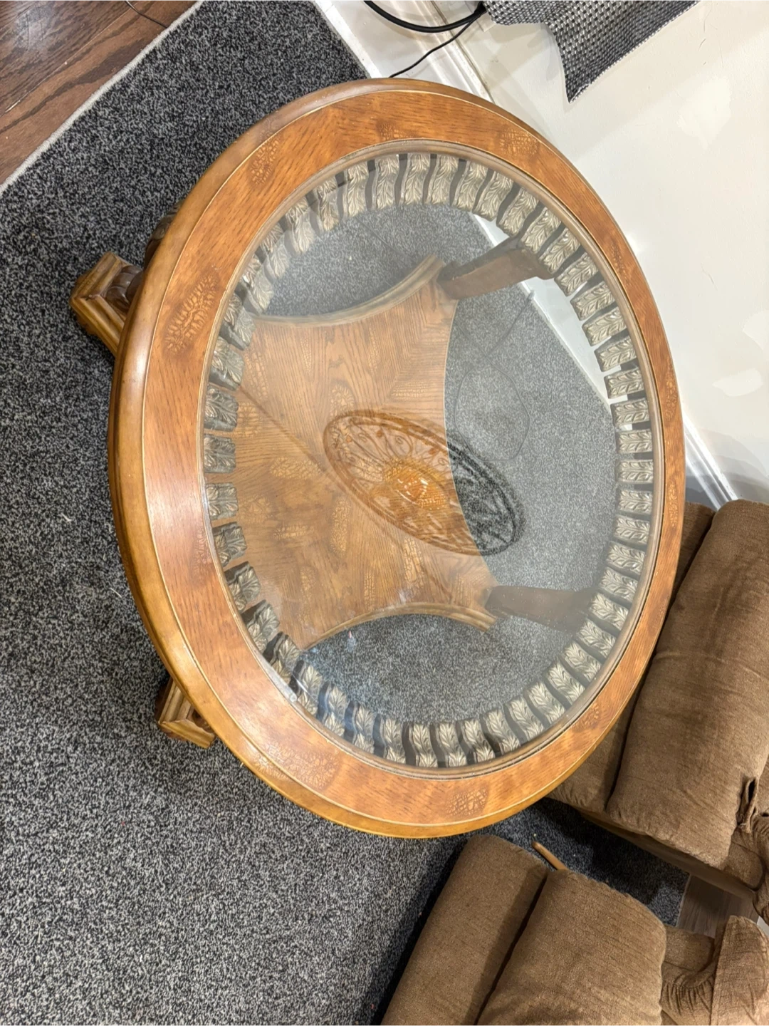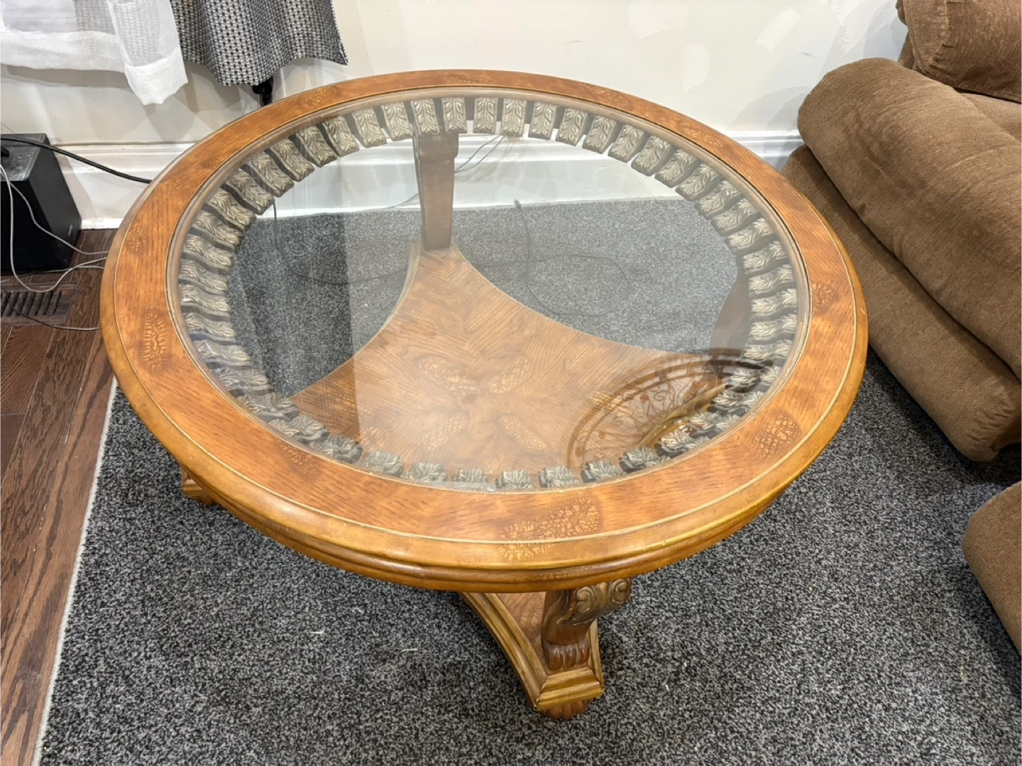 Selling a lovely round coffee table with a glass top. It has a beautiful wood finish and a unique design around the edge of the glass. It's in great condition and would be a nice addition to any living room!