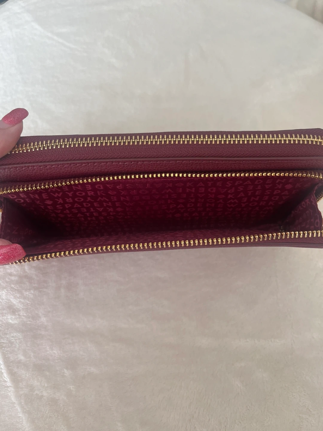 JUST REDUCED to 29.00 - for a great Christmas gift! Selling this NEW Kate Spade wallet in a beautiful rich burgundy colour! It is new - never used! It has many compartments and lots of space for cards and cash. Perfect for keeping everything super organized!