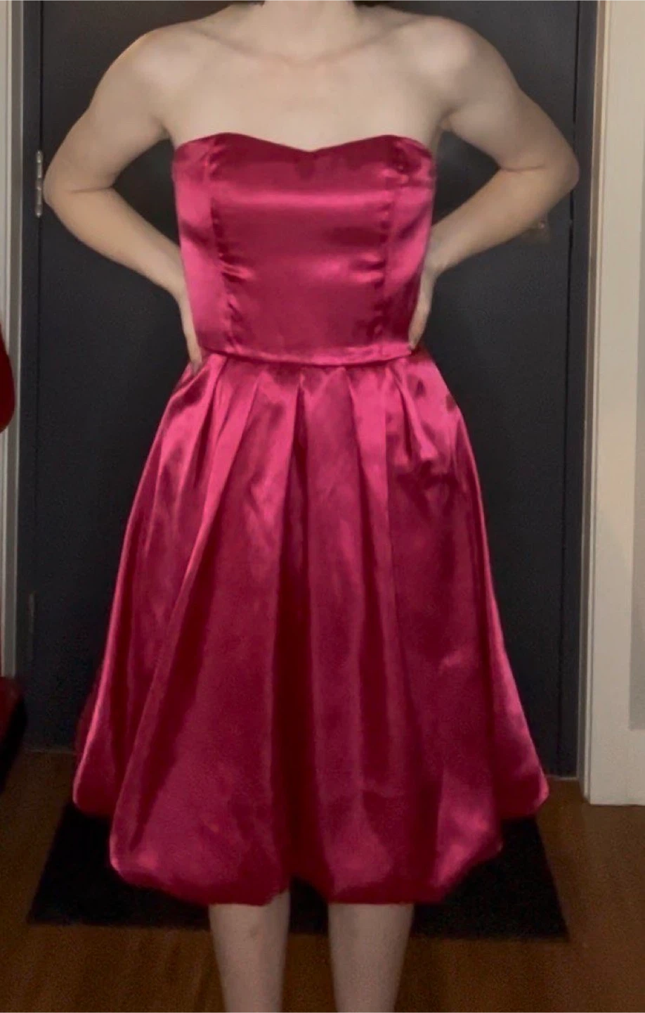 Selling a beautiful pink strapless dress! It's made of a lovely satin material and would be perfect for any occasion.