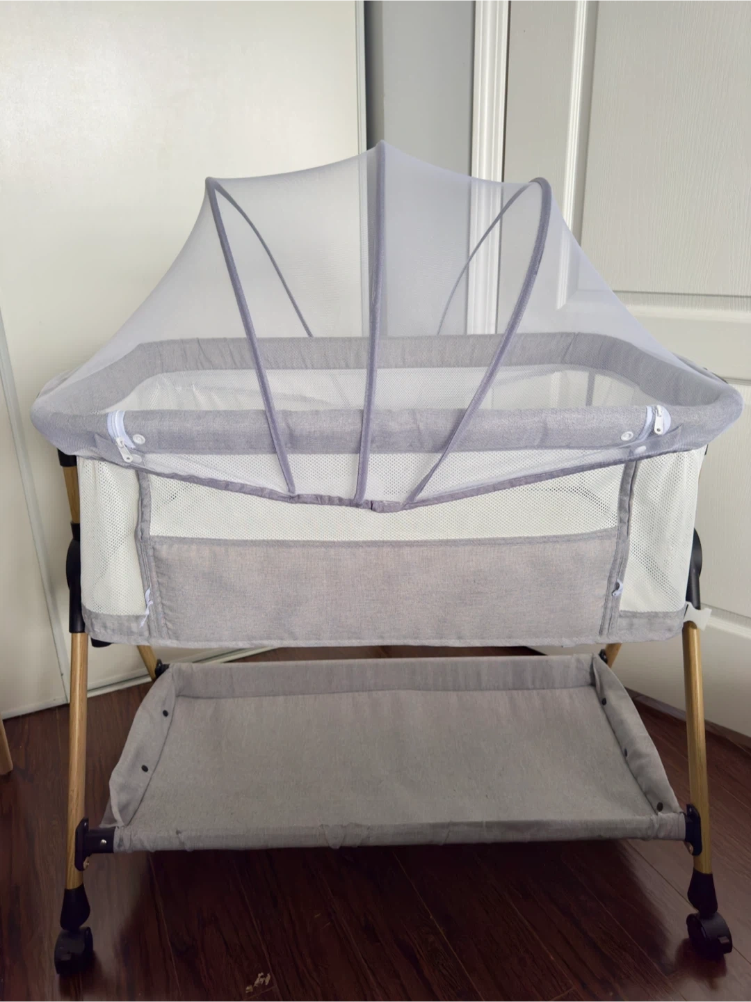 Rocking baby bassinet. Used for just 12 weeks with puppy pads for protection, so the mattress is in pristine condition. Includes two waterproof mattress covers—one still brand new and never used. All parts are fully washable.