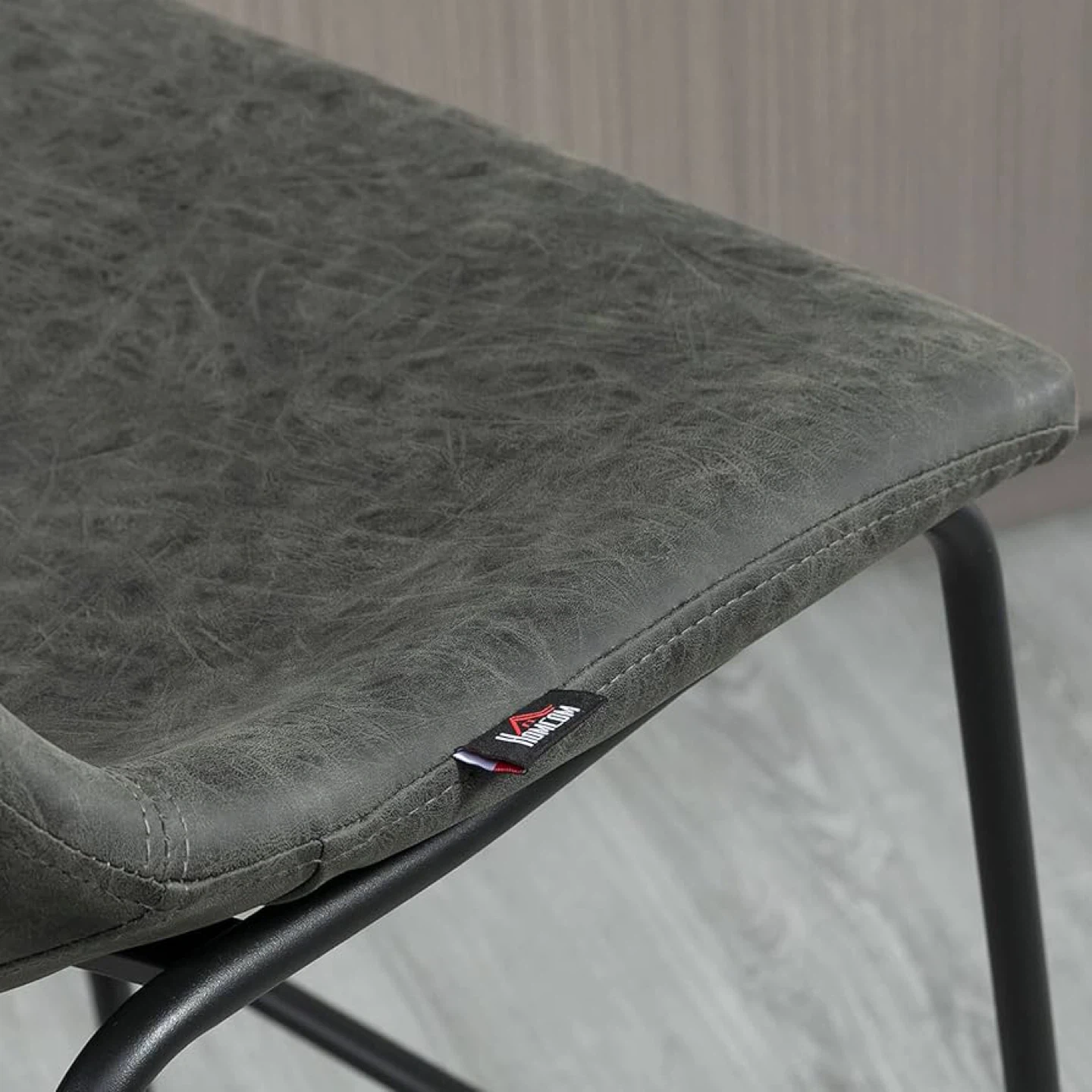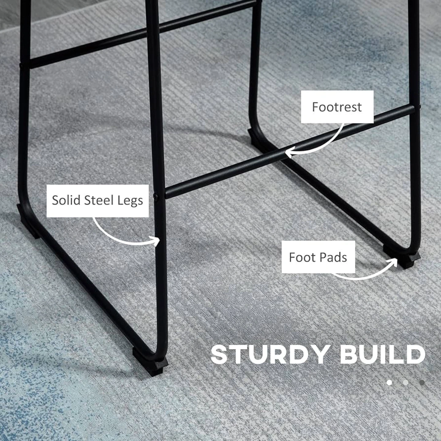 These vintage-style bar stools would be a great addition to any kitchen or bar area! They feature a distressed PU leather seat and solid steel legs for a sturdy build. The footrest and foot pads add extra comfort and stability